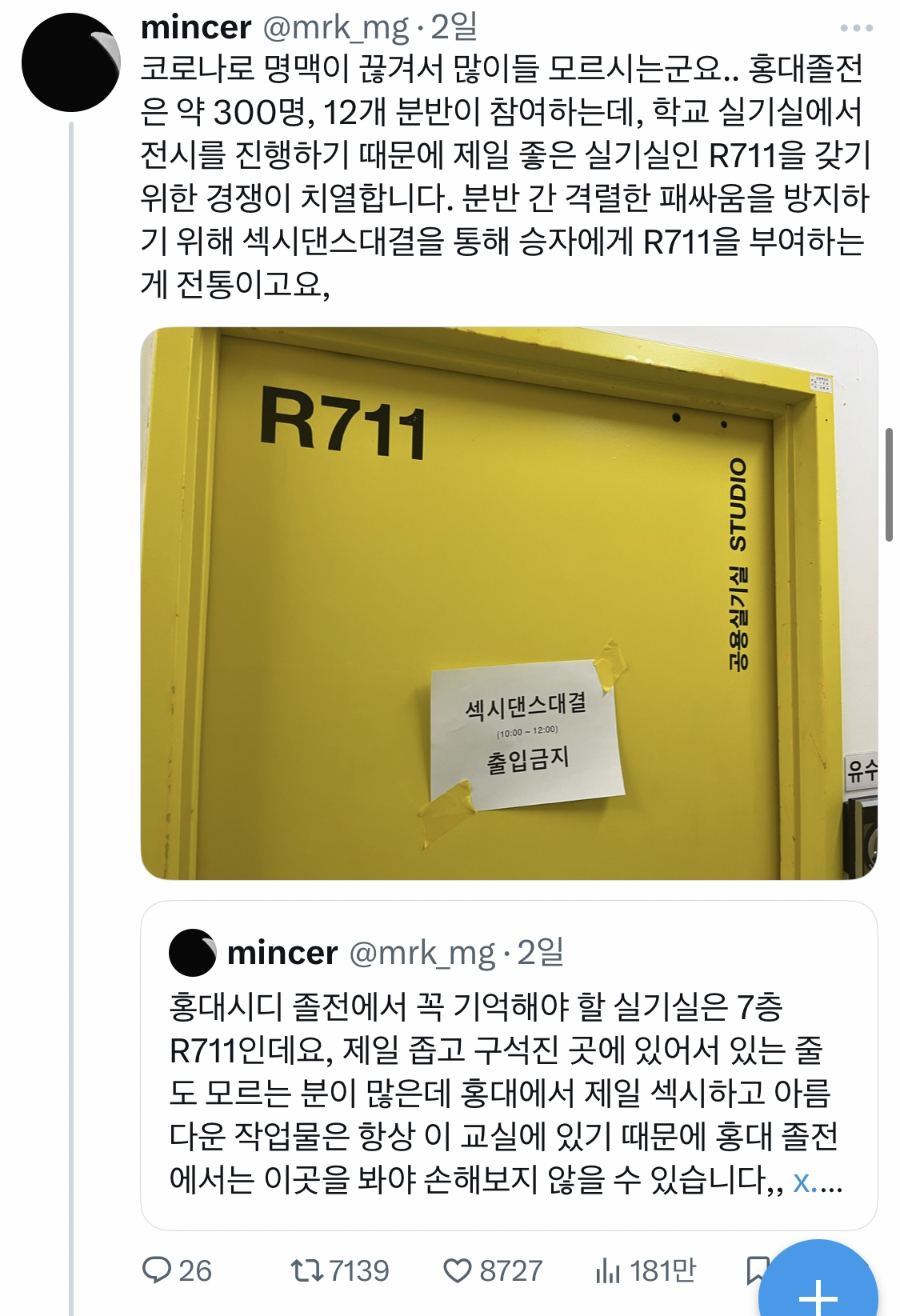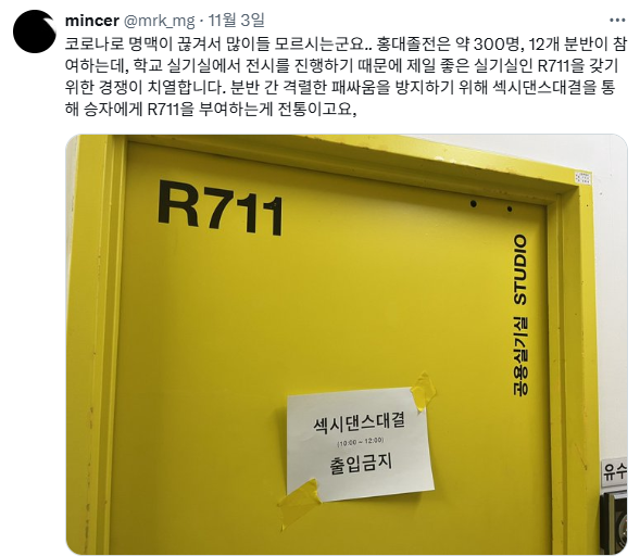 최근 X에서 홍익대 시각디자인과(이하 '시디과') 졸업 작품 전시회(이하 '졸전')의 전시실 ‘R711’에 관한 수상한 소문이 돌았다. 바로 ‘섹시 댄스 대결을 펼쳐 우승자에게 가장 좋은 전시 공간인 R711 실기실을 배정한다.’라는 이야기. 많은 이들이 소문의 사실 여부를 궁금해하지만, 아직 명확히 밝혀지지 않았다.