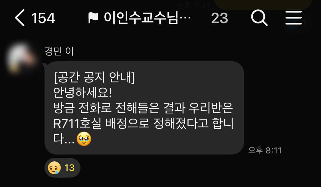 이후 아직 배정 결과를 모르는 다른 사람들한테 알려야 하는데, 서로 네가 공유하라고 양보했던 기억이 납니다. 결국 반장에게 책임을 넘겼어요. 반장은 '저희 R711입니다' 한 줄이면 될 내용을 한참을 망설이다 겨우 단톡방에 올렸습니다.