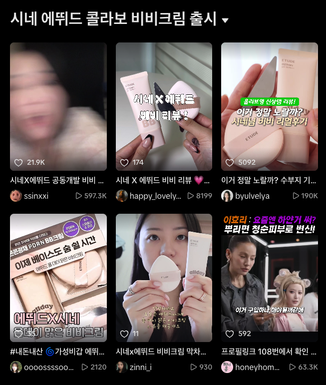 특히 틱톡에서는 뷰티 크리에이터 시장이 빠르게 성장하며, 브랜드와 크리에이터의 협업 제품이 연달아 출시되고 있습니다. 크리에이터 ‘시네’는 2024년 에이프릴스킨과 두 차례 협업한 데 이어, 올해 3분기에는 에뛰드와 협업한 BB크림을 출시해 큰 화제를 불러모았습니다. 시네는 자신의 틱톡 계정에서 제품의 장점뿐 아니라 단점까지 솔직하게 이야기하는 리뷰 영상을 꾸준히 올리며 팬들의 신뢰를 얻었고, 이러한 ‘진정성’에 감동한 댓글이 1만 개가 넘는 좋아요를 받기도 했습니다.