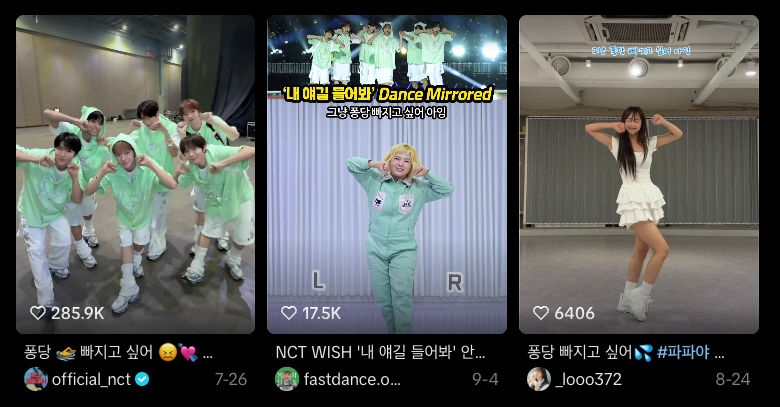 NCT 위시가 커버한 파파야의 <내 얘길 들어봐> 틱톡 챌린지 유행이러한 흐름은 틱톡에서 더욱 선명하게 나타납니다. 최근 틱톡에서는 2000년에 발매된 파파야의 <내 얘길 들어봐>가 다시 유행했습니다. 25년 전 음원이지만, 2016년 오마이걸이 리메이크하며 한 차례 재조명된 바 있고, 2025년 8월에는 NCT 위시가 SBS 가요대제전에서 다시 리메이크하면서 10·20대에게까지 널리 알려졌습니다. 틱톡에서는 NCT의 댄스 챌린지에 맞춰 확산되었지만, 정작 유행한 음원은 파파야의 원곡입니다.