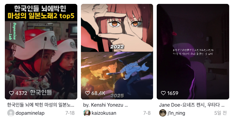 틱톡에서 자주 바이럴되고 있는 요네즈 켄시의 노래일본 애니메이션이 유행할 때, 항상 함께 화제가 되었던 J-Pop도 요즘은 성수동, 용리단길 등 이곳저곳에서 흘러나옵니다. 틱톡에서도 이런 음원을 활용해 숏폼 영상을 만드는 Z세대가 많기도 하고요. 음악평론가 임희윤은 애니메이션의 인기가 커질수록 주제가나 OST 아티스트가 함께 주목받는 경향이 강하며, 지리적·문화적으로 가까운 일본 음악은 국내에서 상대적으로 진입 장벽이 낮아 더 빠르게 확산될 수 있다고 설명합니다.
