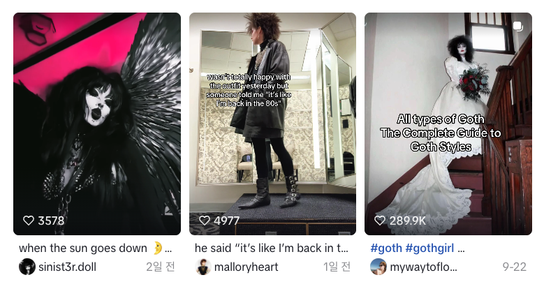 고스 룩은 ‘고딕 패션’이라고도 불리며, 어둡고 절망적인 감성을 담은 고스 록을 즐기던 뮤지션들 사이에서 발전한 스타일입니다. 서구권의 패션·음악계에서도 비교적 마이너한 장르로 취급되던 문화지만, 특유의 고혹적인 분위기와 퇴폐적 무드가 Z세대의 취향에 맞아떨어지면서 틱톡을 중심으로 새로운 유행으로 부상했습니다. 최근 해외 틱톡에서는 ‘80’s goth fashion’ 키워드가 패션 카테고리에서 하나의 트렌드로 자리 잡을 정도로 다시 화제가 되고 있기도 합니다.