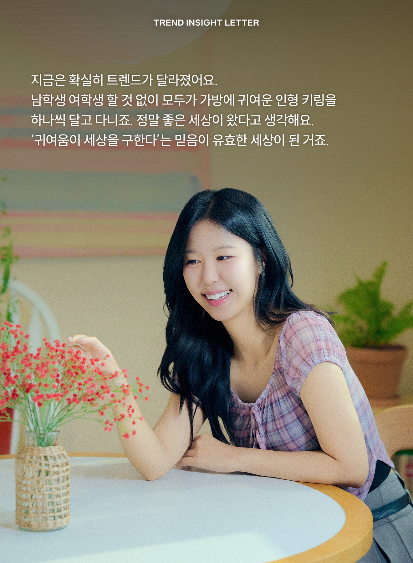 예전에는 덕질이 뭔가 ‘숨겨야 하는 취향’ 이었던 것 같아요. 가방에 캐릭터 키링이라도 달고 다니면 “쟤 오타쿠 아냐?”라며 수군거렸잖아요. 그런데 지금은 확실히 트렌드가 달라졌어요. 남학생 여학생 할 것 없이 모두가 가방에 귀여운 인형 키링을 하나씩 달고 다니죠. 정말 좋은 세상이 왔다고 생각해요. ‘귀여움이 세상을 구한다’는 믿음이 유효한 세상이 된 거죠.