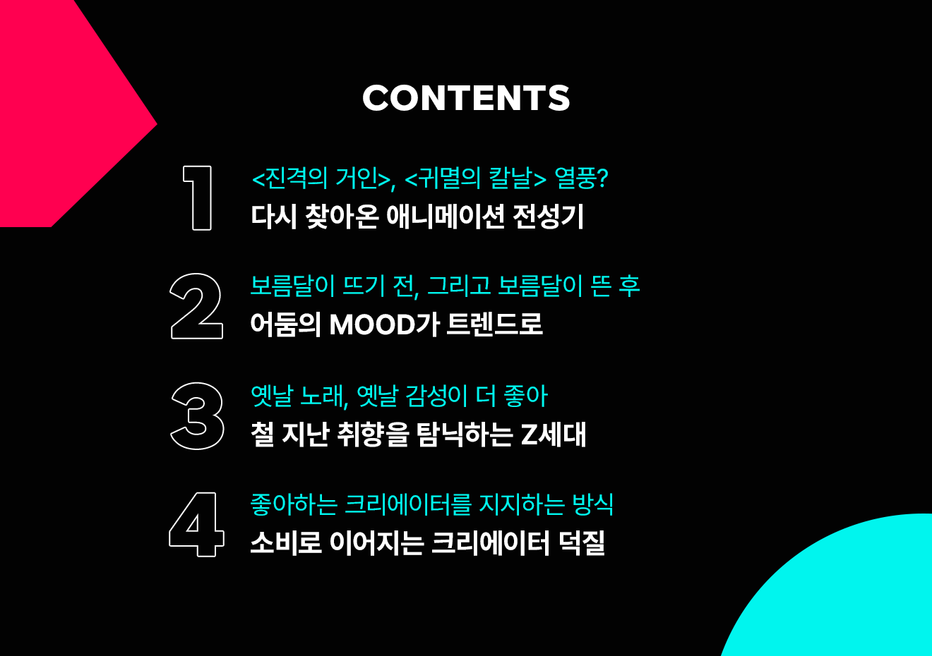 - OTT와 틱톡을 통해 <귀멸의 칼날>, <진격의 거인> 등 애니메이션이 자연스럽게 대중 장르로 확산