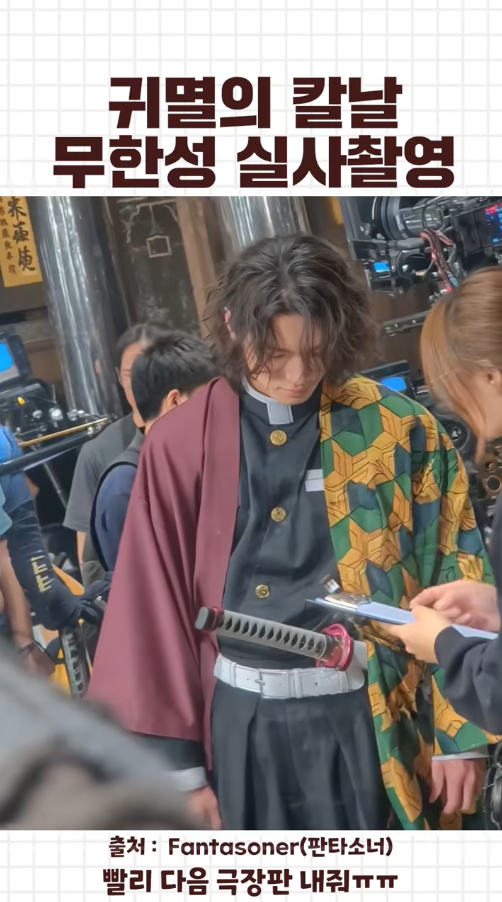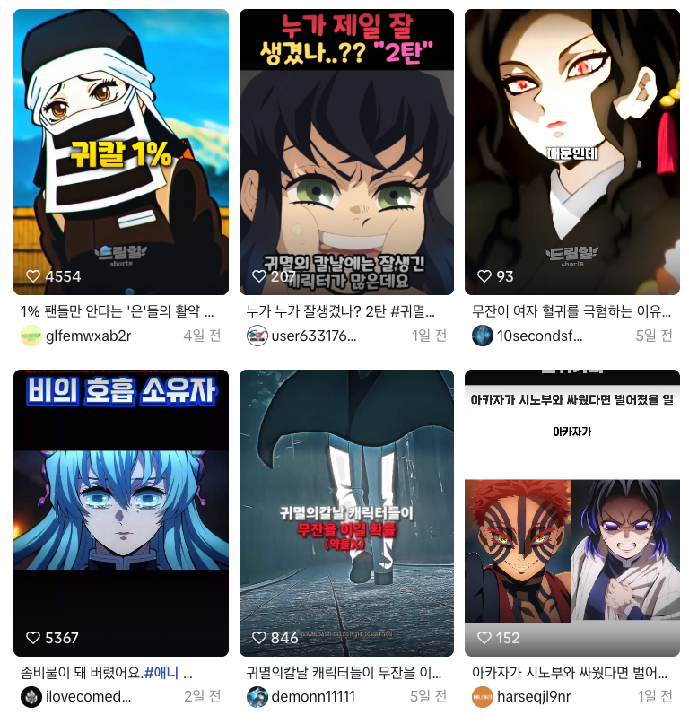 거의 매일 빠짐없이 올라오고 있는 <귀멸의 칼날> 관련 틱톡 콘텐츠틱톡에서도 이러한 흐름은 그대로 드러납니다. <귀멸의 칼날: 무한성편>의 흥행 이후 성우진의 녹음 장면을 편집한 숏폼이나 코스프레 영상이 유행하기도 했고, 최근에는 AI 활용이 증가하면서 애니메이션 원작의 ‘실사 영화 촬영장 비하인드’를 AI로 생성한 영상이 화제가 되고 있습니다. 실사 영화가 존재하지 않음에도 실제 촬영 현장을 구현한 듯한 영상은 팬들의 상상력을 자극하며 작품에 대한 과몰입을 돕고 있습니다.