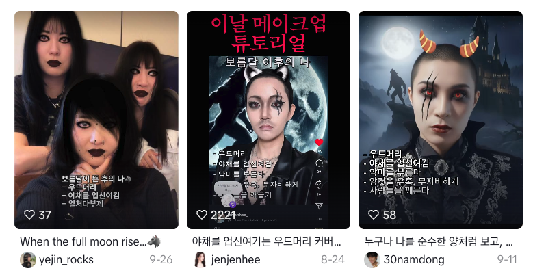 그중에서도 올해 3분기에 특히 크게 유행한 밈이 바로 ‘보름달 뜨기 전 / 보름달이 뜬 후’ 영상입니다. 평소에는 순진무구한데 보름달이 뜨면 포악하고 어두운 모습으로 변한다는 콘셉트의 숏폼으로, 셀카 영상 위에 그로테스크하고 다크한 분위기의 필터를 입혀 본인의 ‘숨겨진 다른 자아’를 드러내는 것이 특징입니다. 이때 사용되는 필터는 일반인에게는 다소 낯설지만, 고스(Goth) 메이크업과 매우 닮아 있습니다.