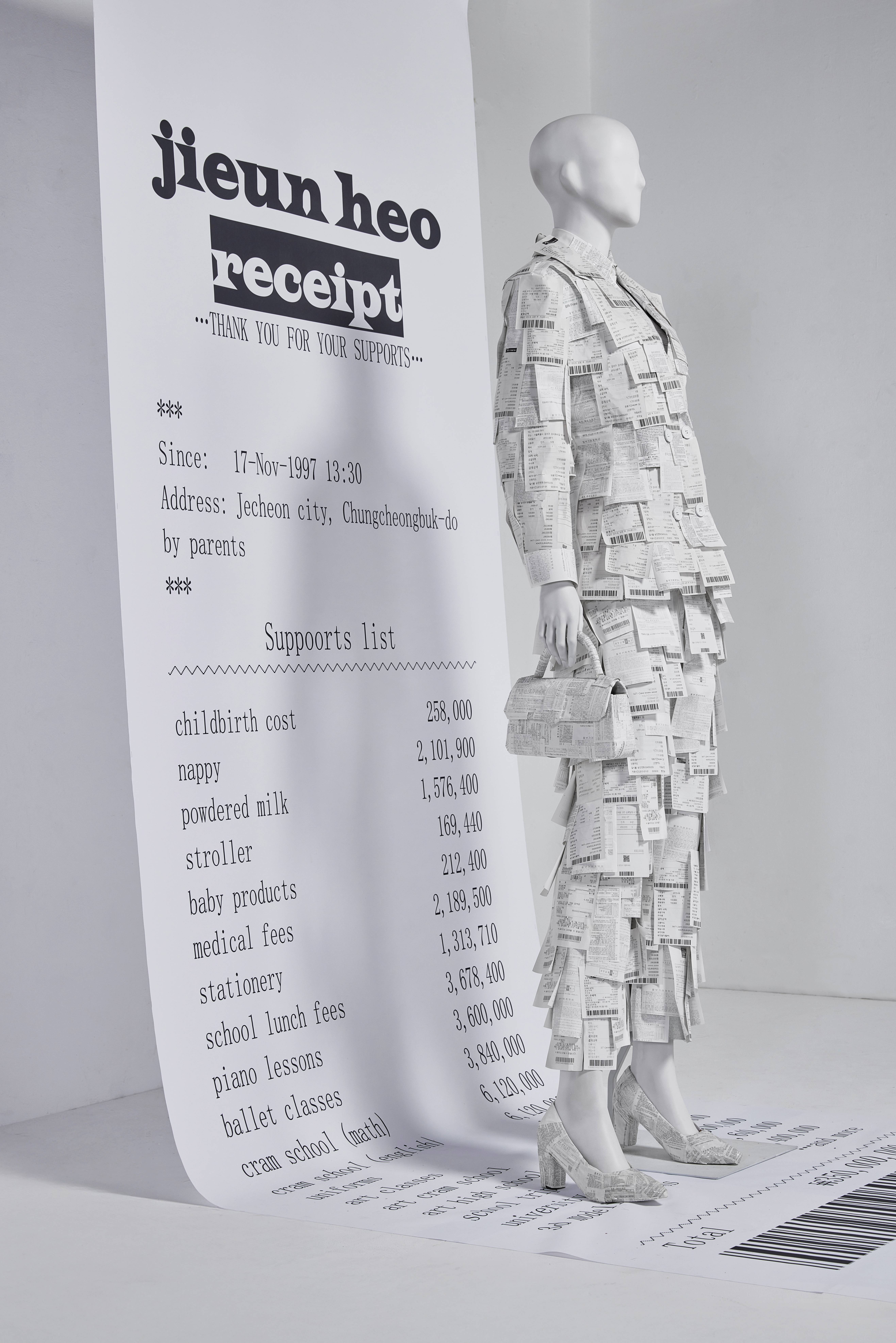 하지만, 저 역시도 금액을 아끼기 위해 전시 방식을 바꾸기도 했어요. 첫 기획은 의류 매장에 있는 마네킹 받침대를 제작하는 방향이었습니다. 원기둥 모양 받침대의 제작 단가가 기본 40만 원으로 너무 높아서, 현재 방식으로 변경했습니다. 원기둥 받침대 대신 인쇄 비용으로 7만 원이 들었어요. 결과적으로 시각적 효과가 커서 만족스럽습니다.