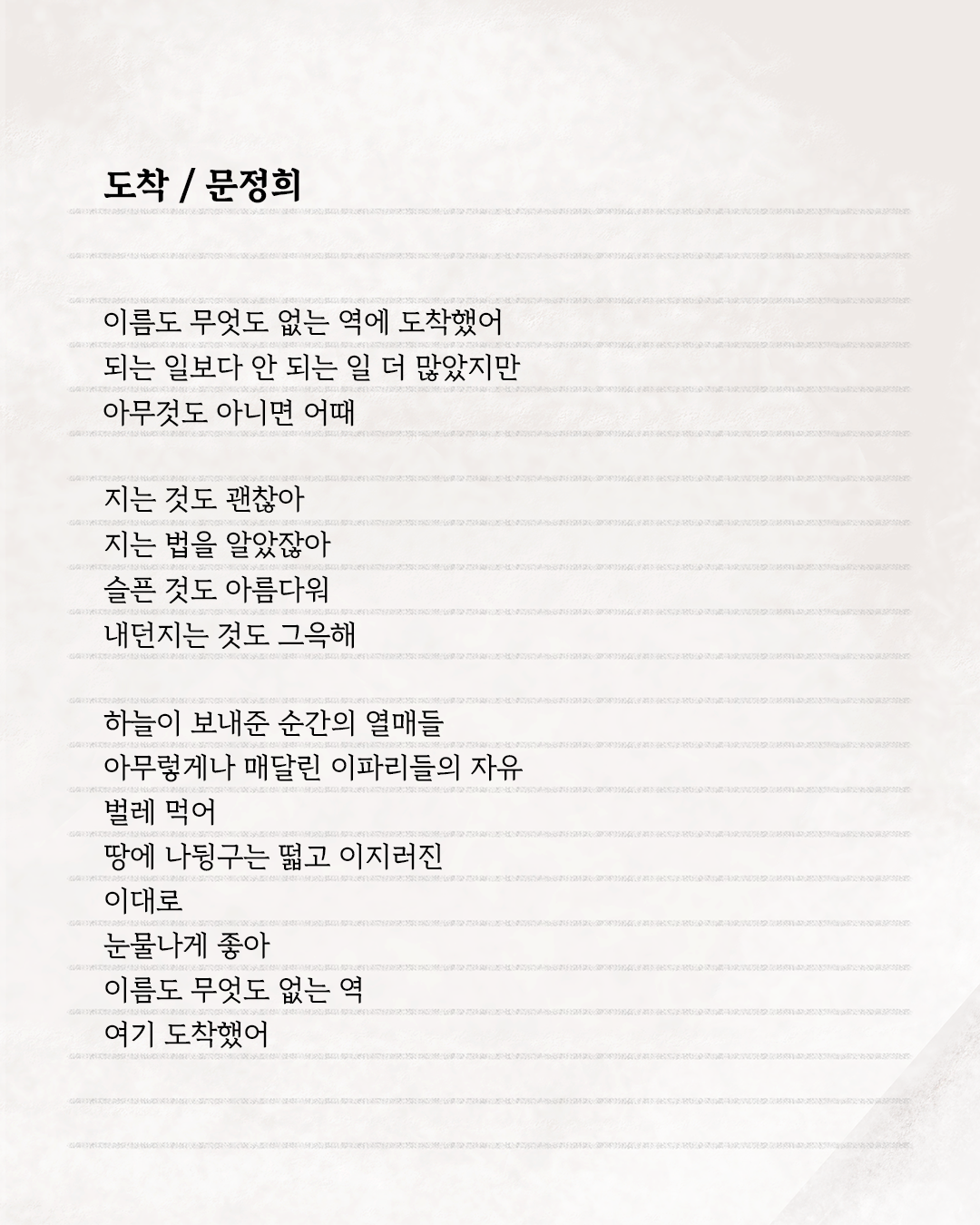 문정희 시인의 ‘도착’을 추천하고 싶다. 살면서 가장 많이 좌절하고 기뻐하던 때가 언제였나 떠올려 보면, 대부분 대학 시절이었다. 이 시는 별것 아닌 일이 나에게는 세상의 멸망처럼 느껴지는 순간도 있지만, 결국은 전부 별일 아니라고, 모든 경험에는 나름의 의미가 있다고 말하며 위로를 건넨다.