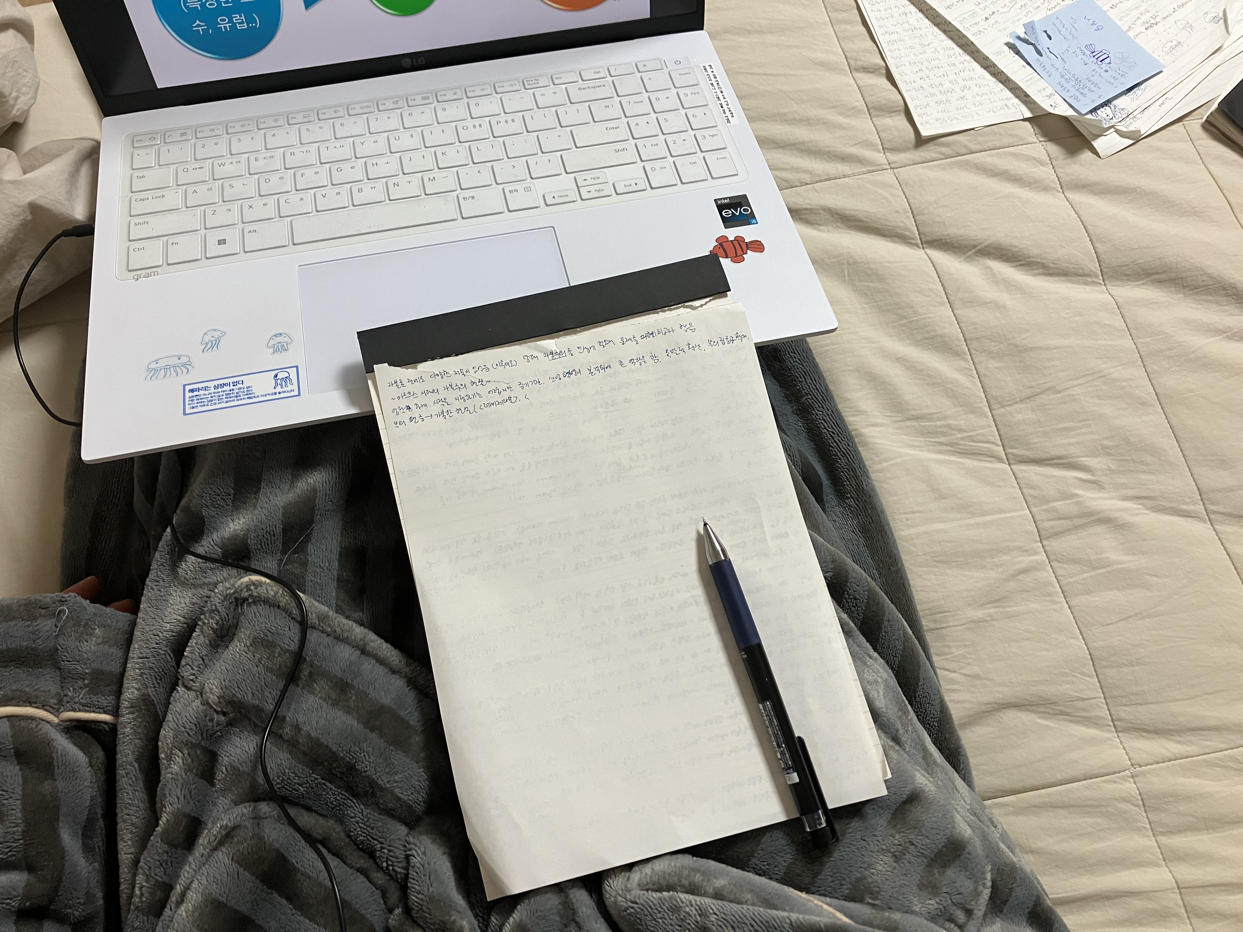 그동안 외면했던 많은 분량의 자료를 한꺼번에 독해하고, 주장을 세워보면서 거의 밤을 새웠어요. 시험기간 동안 이미 며칠째 제대로 자지 못해 아주 피곤했지만, 시험을 끝내고 수업을 같이 듣던 친구와 영화관 나들이를 즐길 생각을 하면서 버텼습니다.
