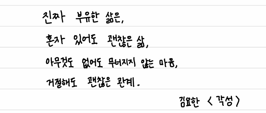 문장 필사 : 박경빈 제공“진짜 부유한 삶은, 혼자 있어도 괜찮은 삶, 아무것도 없어도 무너지지 않는 마음,