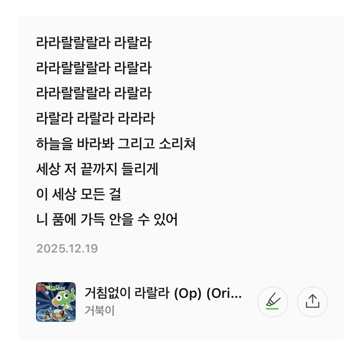 특히 이 노래를 고른 이유는 가사에 계속 등장하는 ‘라랄라’ 때문이에요. 제목처럼 반복되는 이 가사가 괜히 웃기고 귀엽게 느껴지면서, 동시에 제가 도전할 때 가져가고 싶은 태도랑 닮아있어요.