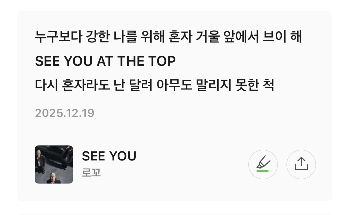 학교도 1년 정도 더 쉬고 다른 일들은 잠시 뒤로 미룬 채 작업실에 틀어박혀 있어 보려고 합니다. 전역은 군생활의 끝이 아니라 제 인생 시즌 2의 시작이에요. 곧 전역을 하면 오랜만에 만나는 친구들이 모두 최고가 되기를 바라고 있어요. 그래서 친구들과 저 자신에게 외치고 싶습니다! 'SEE YOU AT THE TOP'이라고요.