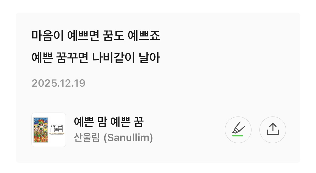 [어린이를 위한 산울림의 동요선물 1]에 수록된 곡인데, 김창완 아저씨가 읊어주는 단순하고 순수한 가사가 인상적이에요. ”마음이 예쁘면 꿈도 예쁘죠 예쁜 꿈꾸며 나비같이 날아“ 듣다 보면 마음이 싱그럽게 정화되는 노래입니다. 저는 어른에게도 동화와 동요가 필요하다고 생각해요. 제 세상에 포용이 많아졌으면 좋겠어요. 그래서 되도록 순수해지고 싶습니다. 가장 깨끗하고 청명한 마음으로 새해를 시작할 수 있기를.