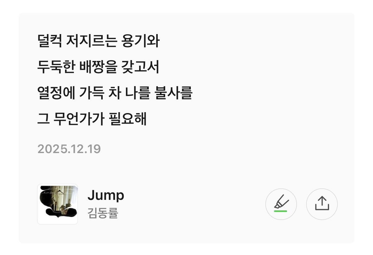 「Jump」는 작년에도 새해 첫 곡으로 들었던 노래예요. 그때 이 곡을 들으며 이루고자 했던 바를 완전히 이루지는 못한 것 같아서, 올해에도 같은 다짐을 안고 한 해를 시작하고자 다시 한번 이 곡을 고르게 되었습니다.
