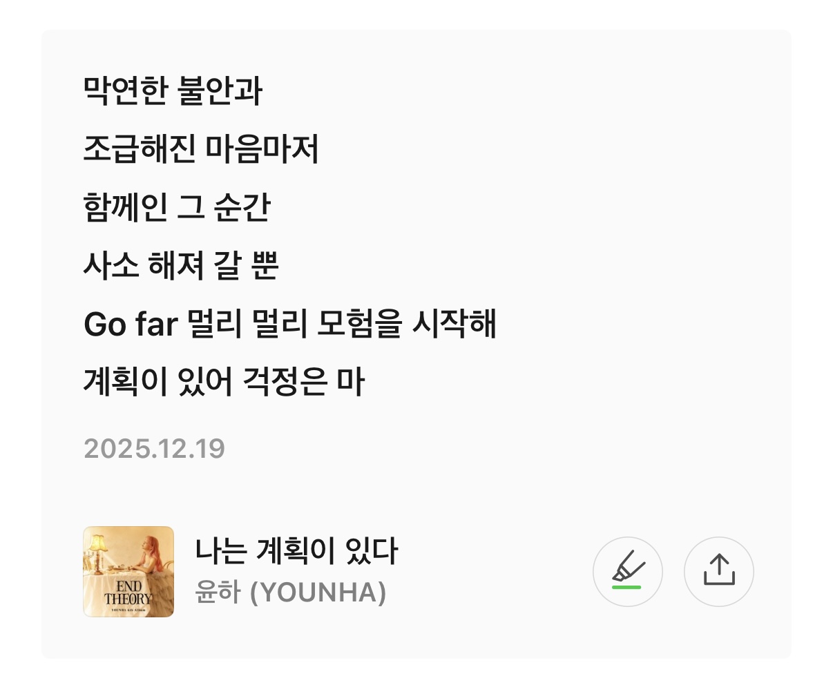 겁이 많아 신중한 저에게 계획은 늘 중요한 존재였습니다. 오히려 완벽한 계획을 세우려다 기회를 놓치는 경우도 많았어요. 이 노래는 ‘계획이 있다’라는 사실, 그리고 그 계획에 공감하고 함께해 줄 사람들이 있다는 사실만으로도 세상에 한 걸음 더 용감하게 뛰어들 수 있게 만들어줍니다.