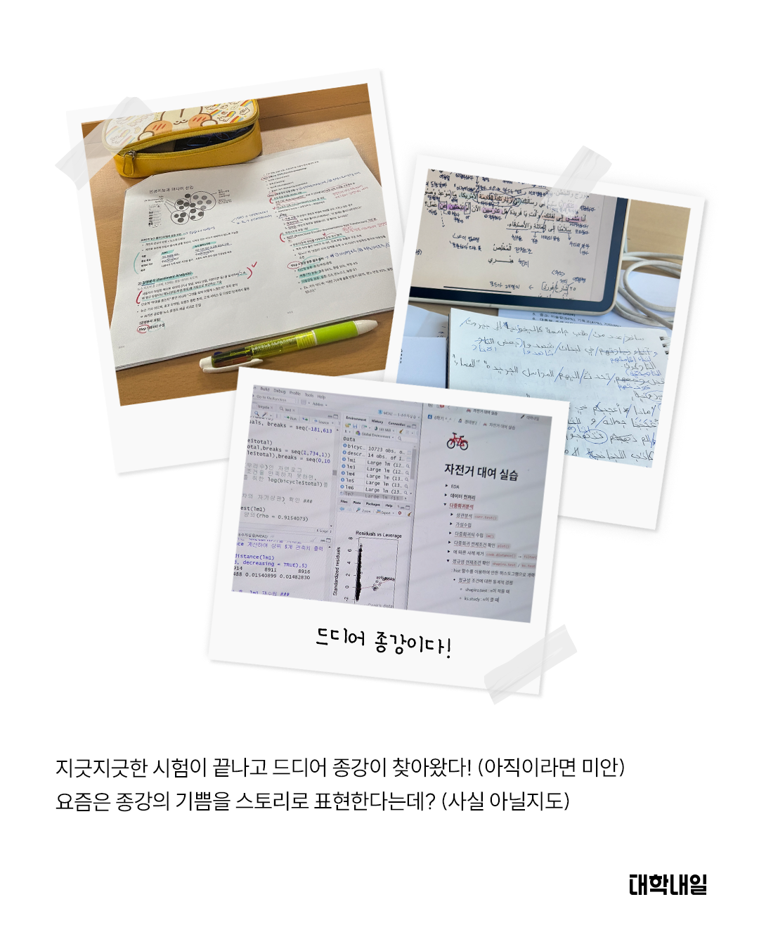 지긋지긋한 시험이 끝나고 드디어 종강이 찾아왔다! (아직이라면 미안). 요즘은 종강의 기쁨을 스토리로 표현한다는데? (사실 아닐지도)