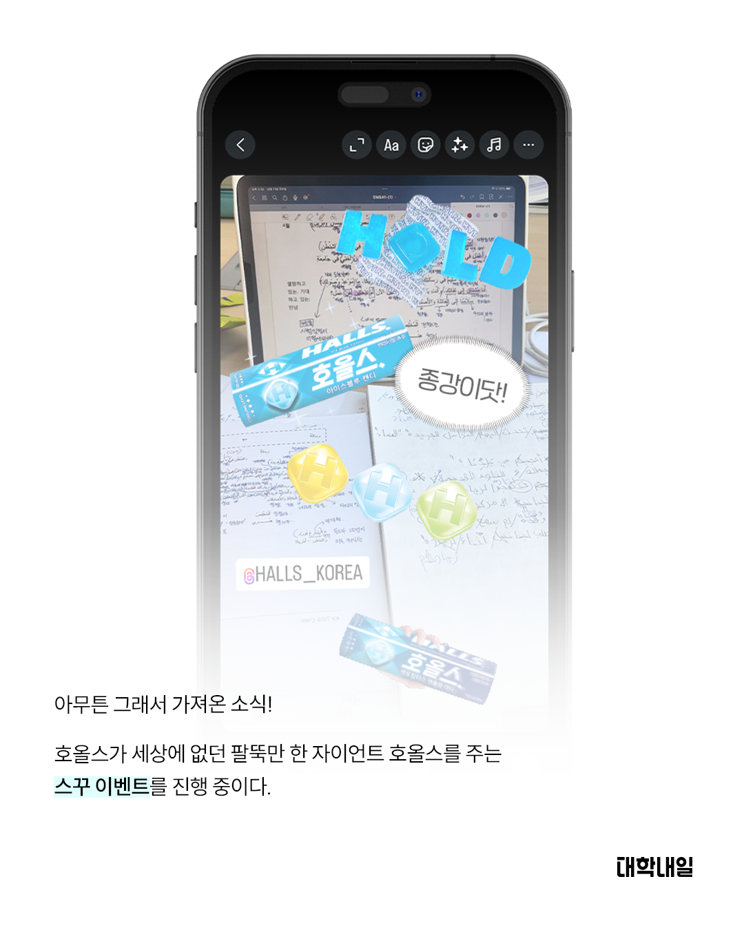 3️⃣ 검색창에 ‘호올스 / Halls’ 입력 후 스티커 자유롭게 배치
