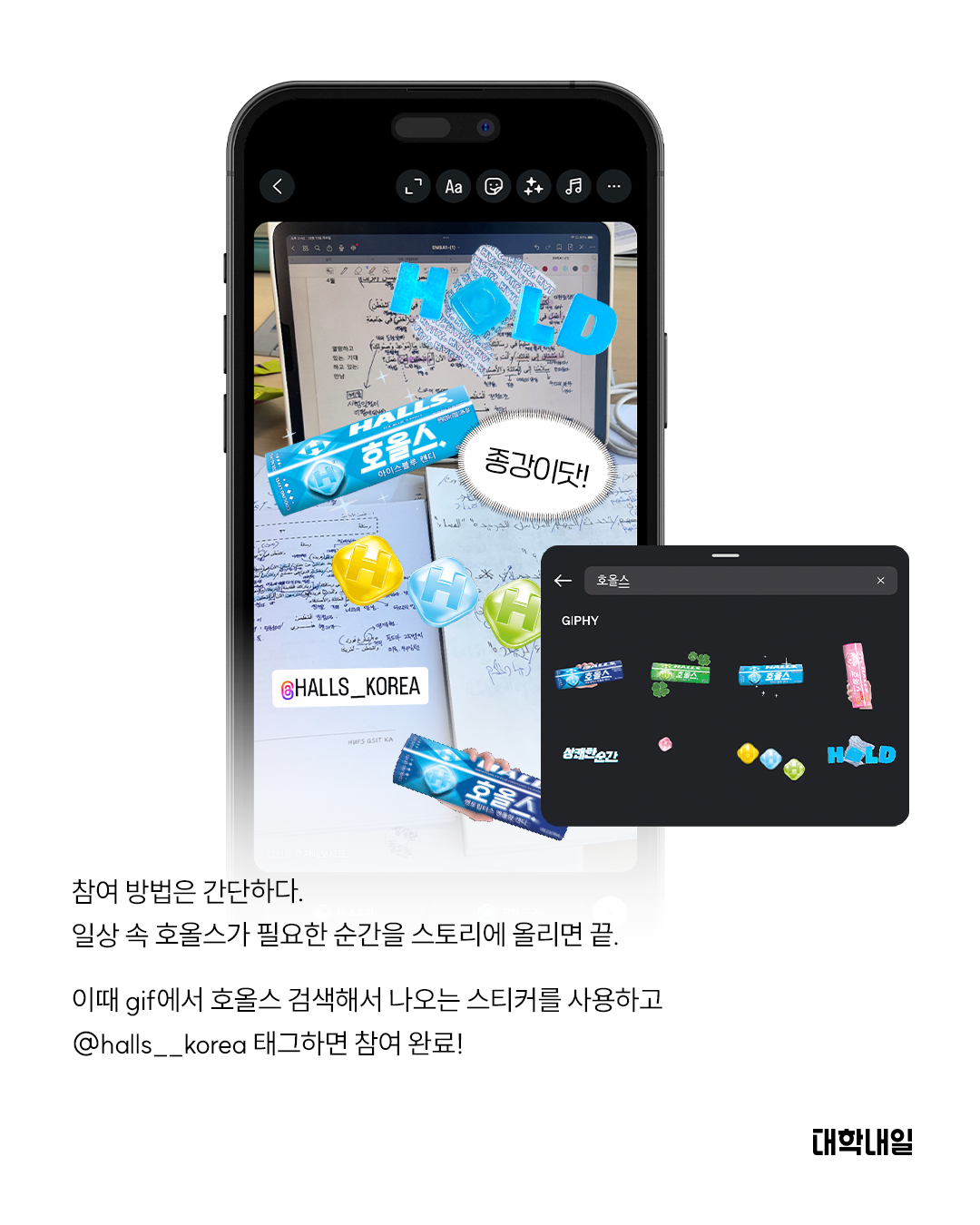 참여 방법은 간단하다. 일상 속 호올스가 필요한 순간을 스토리에 올리면 끝. 이때 gif에서 호올스 검색해서 나오는 스티커를 사용하고 @halls__korea 태그하면 참여 완료!