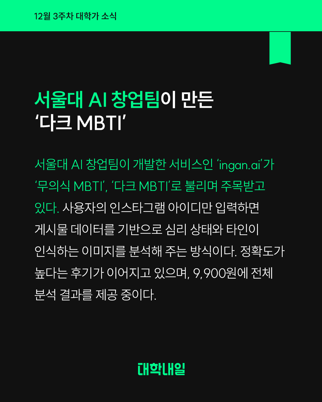 서울대 AI 창업팀이 개발한 서비스인 ‘ingan.ai’가 ‘무의식 MBTI’, ‘다크 MBTI’로 불리며 주목받고 있다. 사용자의 인스타그램 아이디만 입력하면 게시물 데이터를 기반으로 심리 상태와 타인이 인식하는 이미지를 분석해 주는 방식이다. 정확도가 높다는 후기가 이어지고 있으며, 9,900원에 전체 분석 결과를 제공 중이다.