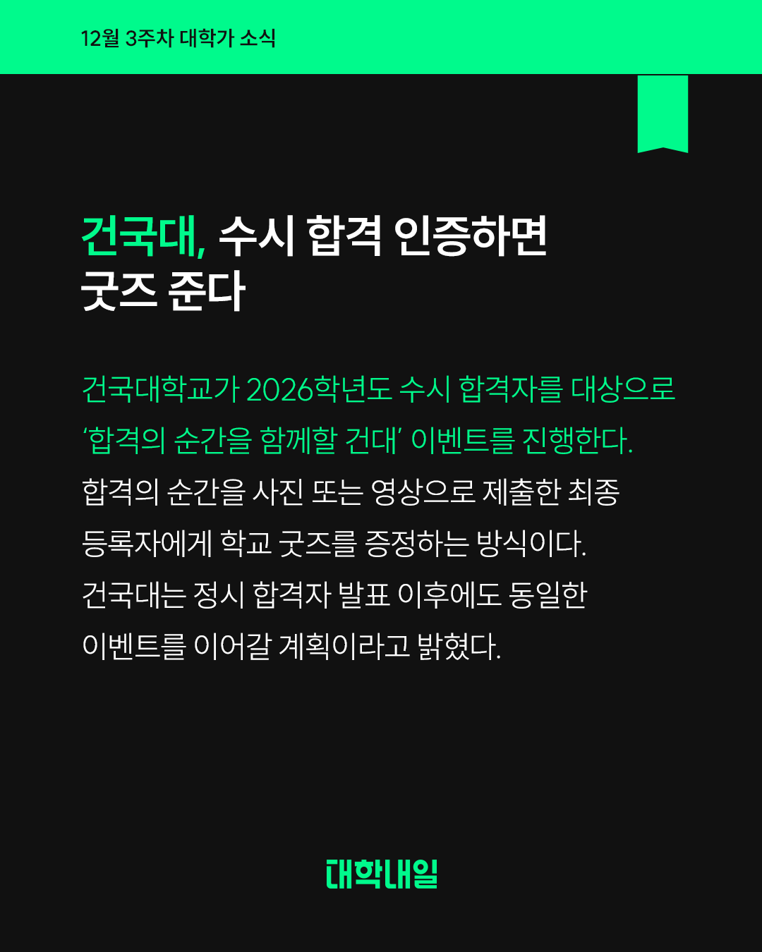 건국대학교가 2026학년도 수시 합격자를 대상으로 ‘합격의 순간을 함께할 건대’ 이벤트를 진행한다. 합격의 순간을 사진 또는 영상으로 제출한 최종 등록자에게 학교 굿즈를 증정하는 방식이다. 건국대는 정시 합격자 발표 이후에도 동일한 이벤트를 이어갈 계획이라고 밝혔다.