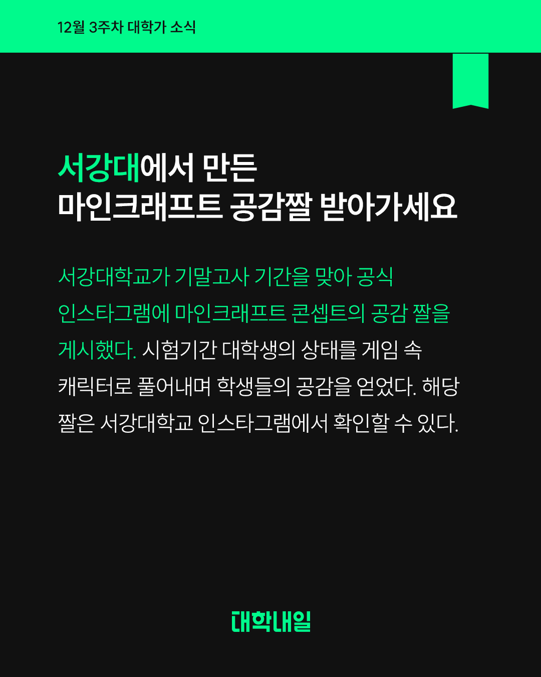 서강대학교가 기말고사 기간을 맞아 공식 인스타그램에 마인크래프트 콘셉트의 공감 짤을 게시했다. 시험기간 대학생의 상태를 게임 속 캐릭터로 풀어내며 학생들의 공감을 얻었다. 해당 짤은 서강대학교 인스타그램에서 확인할 수 있다.