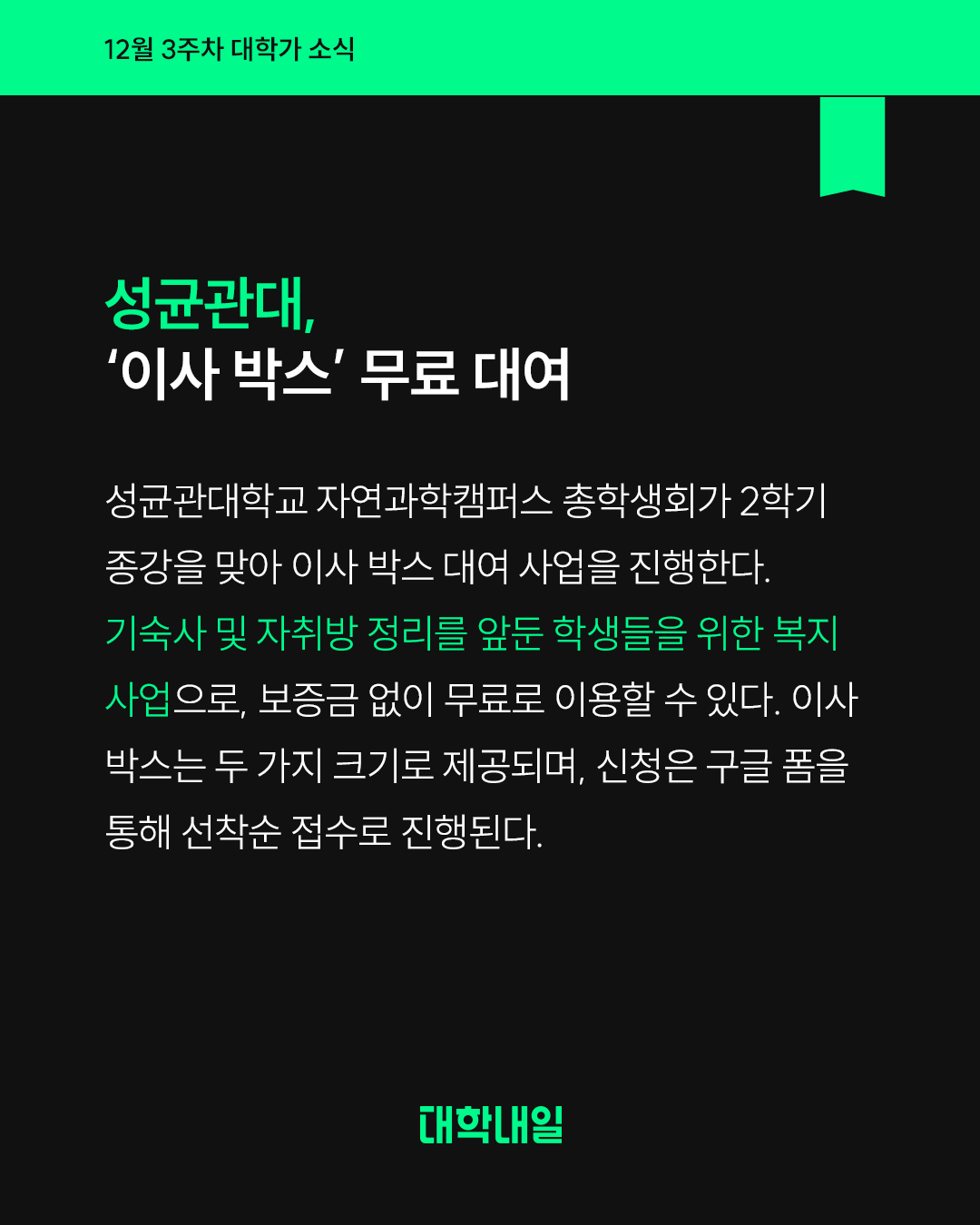 성균관대학교 자연과학캠퍼스 총학생회가 2학기 종강을 맞아 이사 박스 대여 사업을 진행한다. 기숙사 및 자취방 정리를 앞둔 학생들을 위한 복지 사업으로, 보증금 없이 무료로 이용할 수 있다. 이사 박스는 두 가지 크기로 제공되며, 신청은 구글 폼을 통해 선착순 접수로 진행된다.