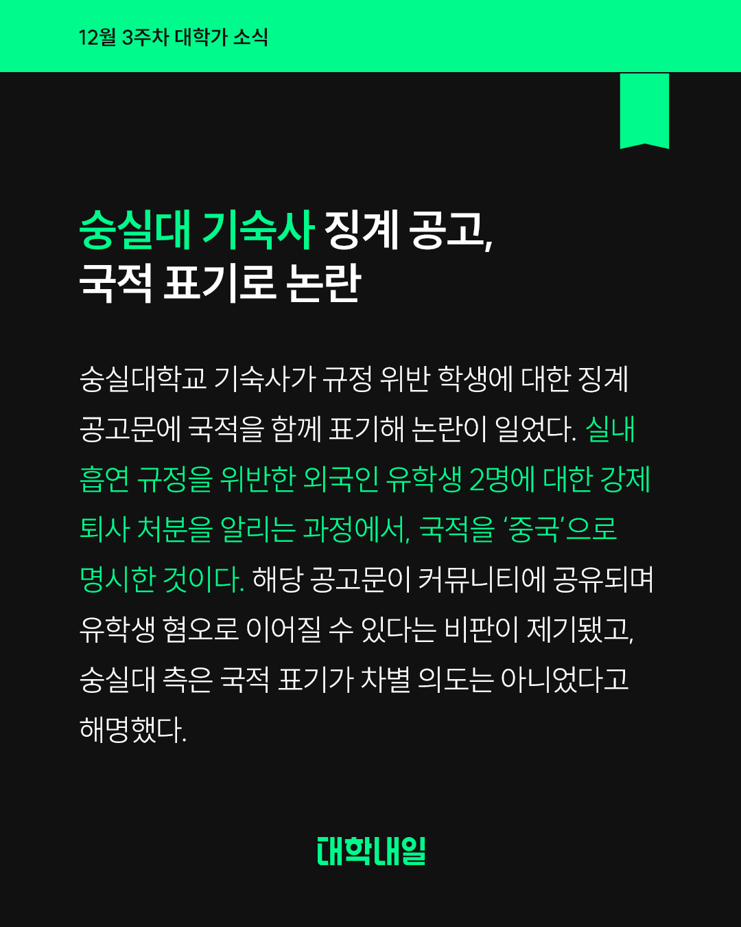 숭실대학교 기숙사가 규정 위반 학생에 대한 징계 공고문에 국적을 함께 표기해 논란이 일었다. 실내 흡연 규정을 위반한 외국인 유학생 2명에 대한 강제 퇴사 처분을 알리는 과정에서, 국적을 ‘중국’으로 명시한 것이다. 해당 공고문이 커뮤니티에 공유되며 유학생 혐오로 이어질 수 있다는 비판이 제기됐고, 숭실대 측은 국적 표기가 차별 의도는 아니었다고 해명했다.