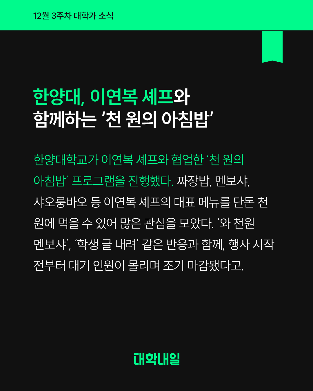 한양대학교가 이연복 셰프와 협업한 ‘천 원의 아침밥’ 프로그램을 진행했다. 짜장밥, 멘보샤, 샤오룽바오 등 이연복 셰프의 대표 메뉴를 단돈 천 원에 먹을 수 있어 많은 관심을 모았다. ‘와 천원 멘보샤’, ‘학생 글 내려’ 같은 반응과 함께, 행사 시작 전부터 대기 인원이 몰리며 조기 마감됐다고.