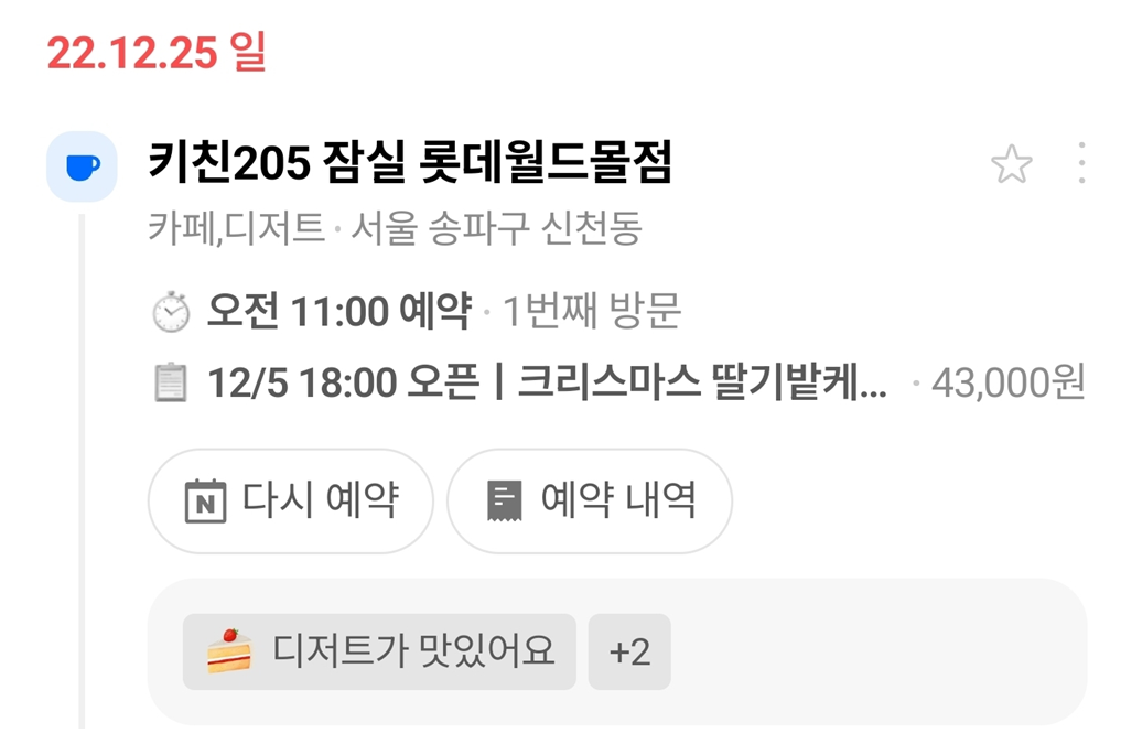 처음 케이크를 사러 갔던 2022년 크리스마스의 일이었어요. 가족들에게 비밀로 하고 경기도에서 잠실까지 케이크를 사러 갔습니다. 왕복 3시간 거리를 이동하며 뿌듯한 마음으로 케이크를 들고 돌아왔어요. 그런데 집에 도착해보니 제가 나갔다는 사실을 모두가 모르고 있었던 거예요. 딸기 케이크가 아니라, 제가 외출한 게 서프라이즈 이벤트였던 웃긴 기억이 있습니다.