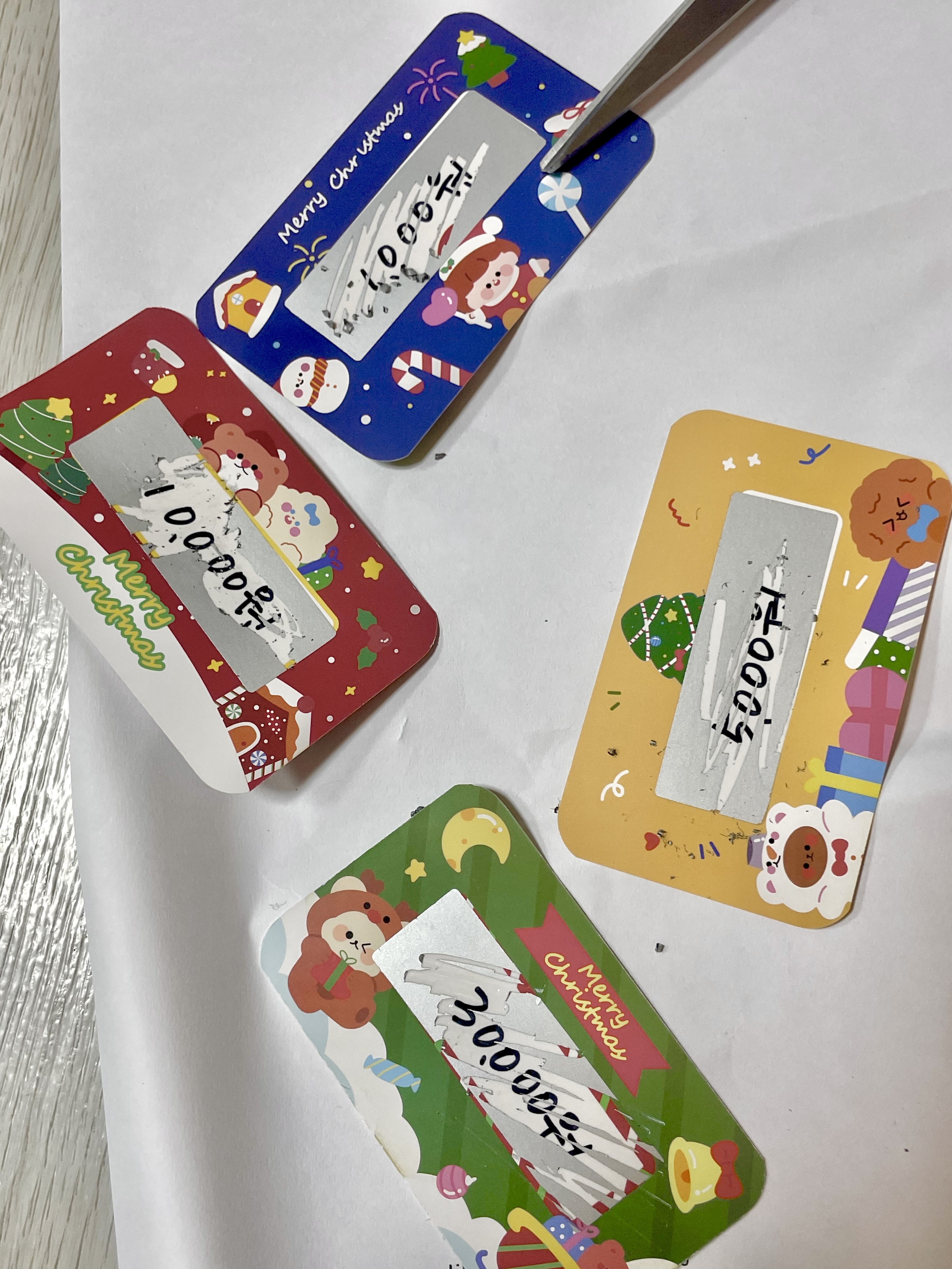 작년에 엄마가 새로운 걸 준비하셨어요. 이른바 ‘엄마 주최 복권 뽑기’였습니다. 엄마가 준비한 스크래치 복권을 각자 뽑아서 긁으면, 적힌 금액만큼 엄마가 용돈을 주는 게임이었습니다. 저는 1등인 3만 원에 당첨되어 행복했지만, 5천 원 당첨된 언니가 굉장히 분해하던 게 기억에 남네요.