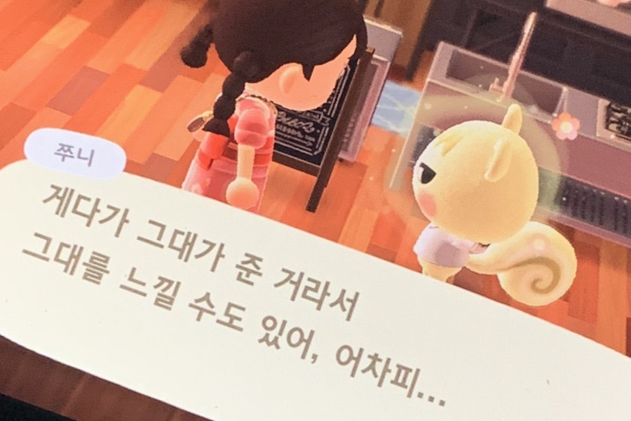 제가 가장 좋아하는 주민은 '쭈니'예요. 시크한 눈매를 가진 크림색 다람쥐인데, 작은 몸집에 달랑거리는 몸만 한 꼬리가 사랑스러워요. 그런데 대사는 또 '그대의 눈동자에 치얼스...'같은 느끼한 대사를 하니... 매력 있는 주민이에요.