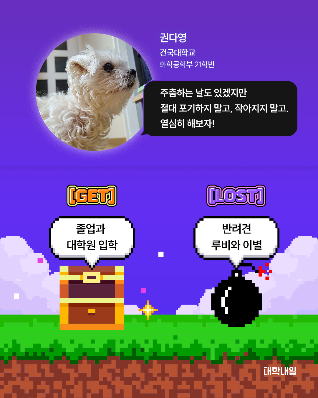 또, 어릴 때부터 소망하던 반려견을 입양했어요. 부모님과 대학에 합격하면 데려오기로 했었던 것이기 때문에, 그 약속을 지키고 강아지를 데려올 수 있어서 기뻤어요.