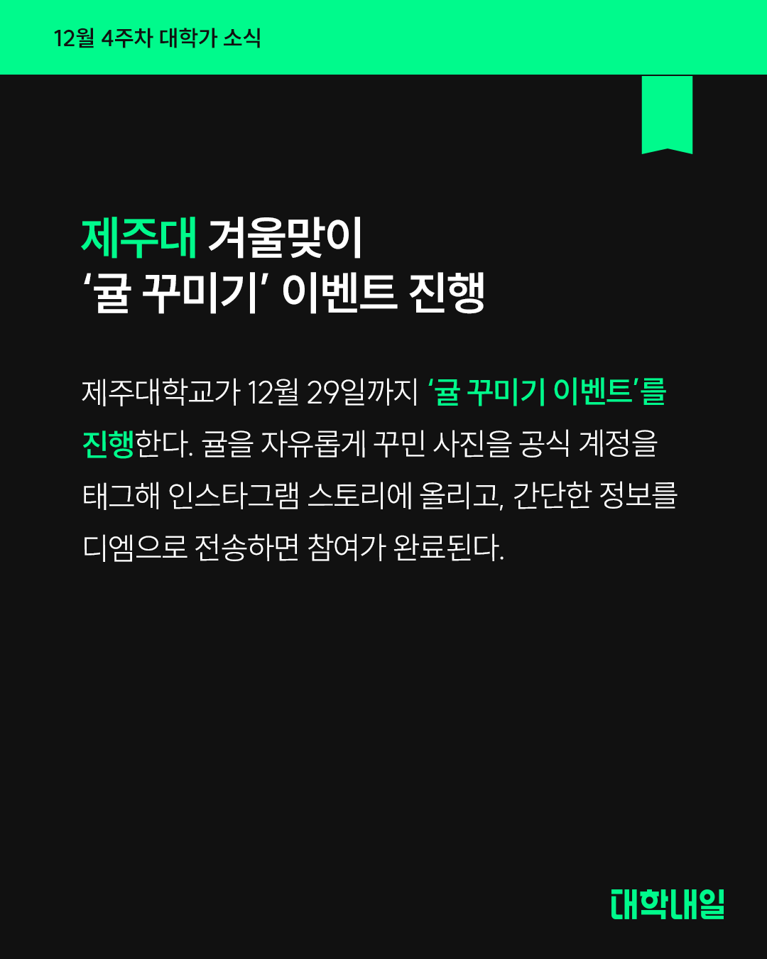 제주대학교가 12월 29일까지 ‘귤 꾸미기 이벤트’를 진행한다. 귤을 자유롭게 꾸민 사진을 공식 계정을 태그해 인스타그램 스토리에 올리고, 간단한 정보를 디엠으로 전송하면 참여가 완료된다.