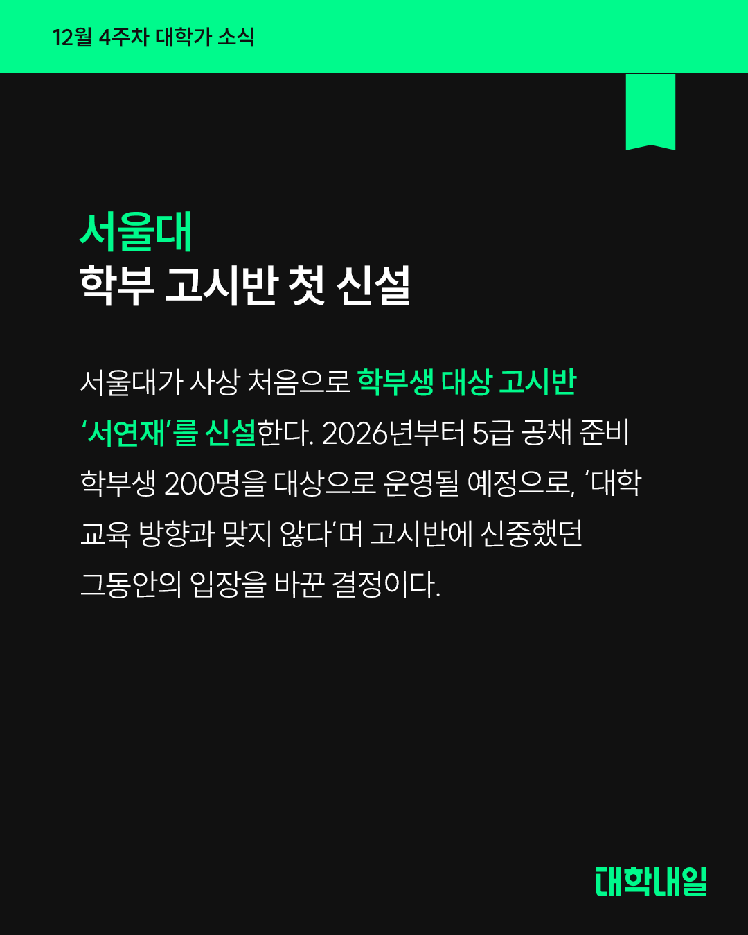 서울대가 사상 처음으로 학부생 대상 고시반 ‘서연재’를 신설한다. 2026년부터 5급 공채 준비 학부생 200명을 대상으로 운영될 예정으로, ‘대학 교육 방향과 맞지 않다’며 고시반에 신중했던 그동안의 입장을 바꾼 결정이다.
