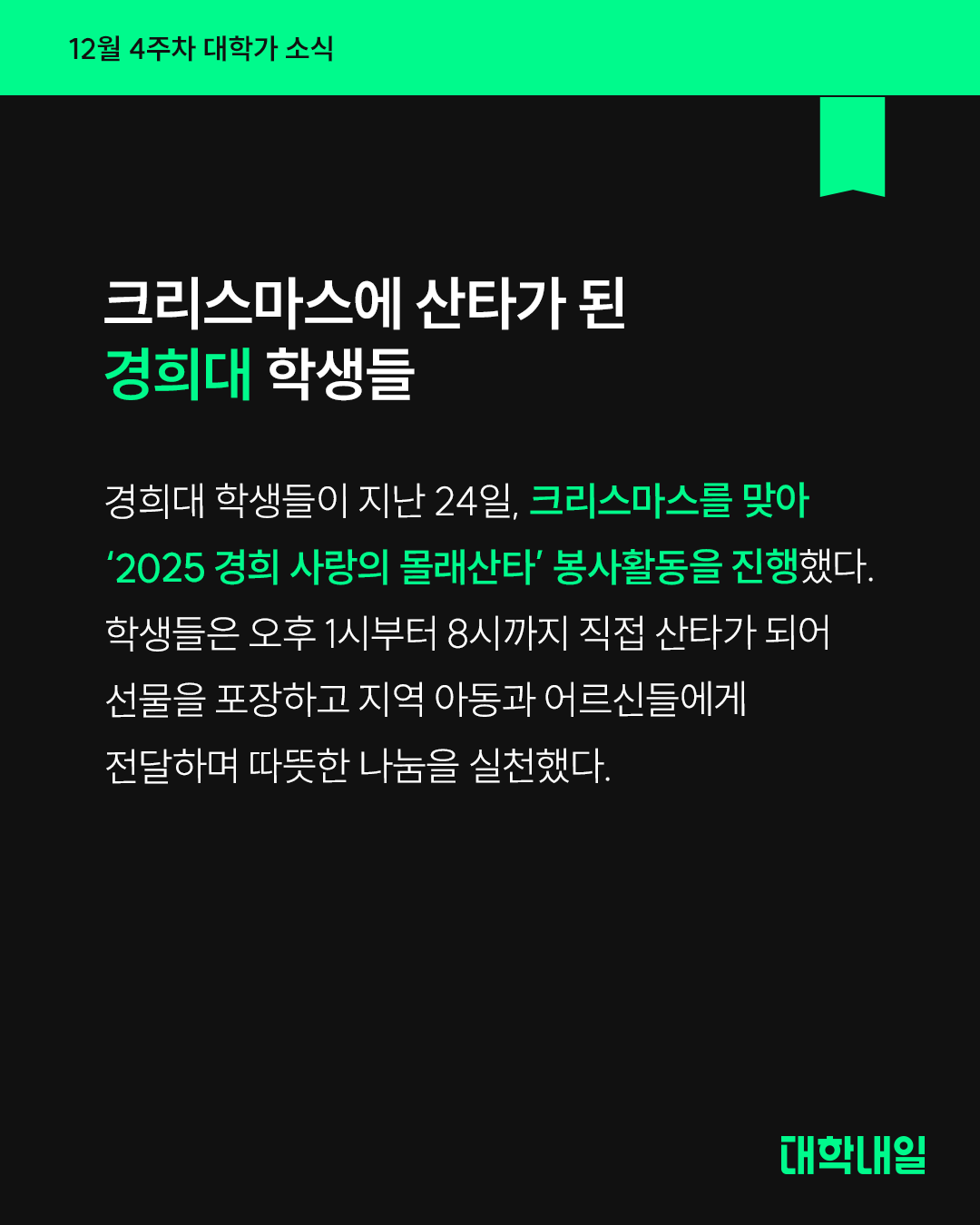 경희대 학생들이 지난 24일, 크리스마스를 맞아 ‘2025 경희 사랑의 몰래산타’ 봉사활동을 진행했다. 학생들은 오후 1시부터 8시까지 직접 산타가 되어 선물을 포장하고 지역 아동과 어르신들에게 전달하며 따뜻한 나눔을 실천했다.