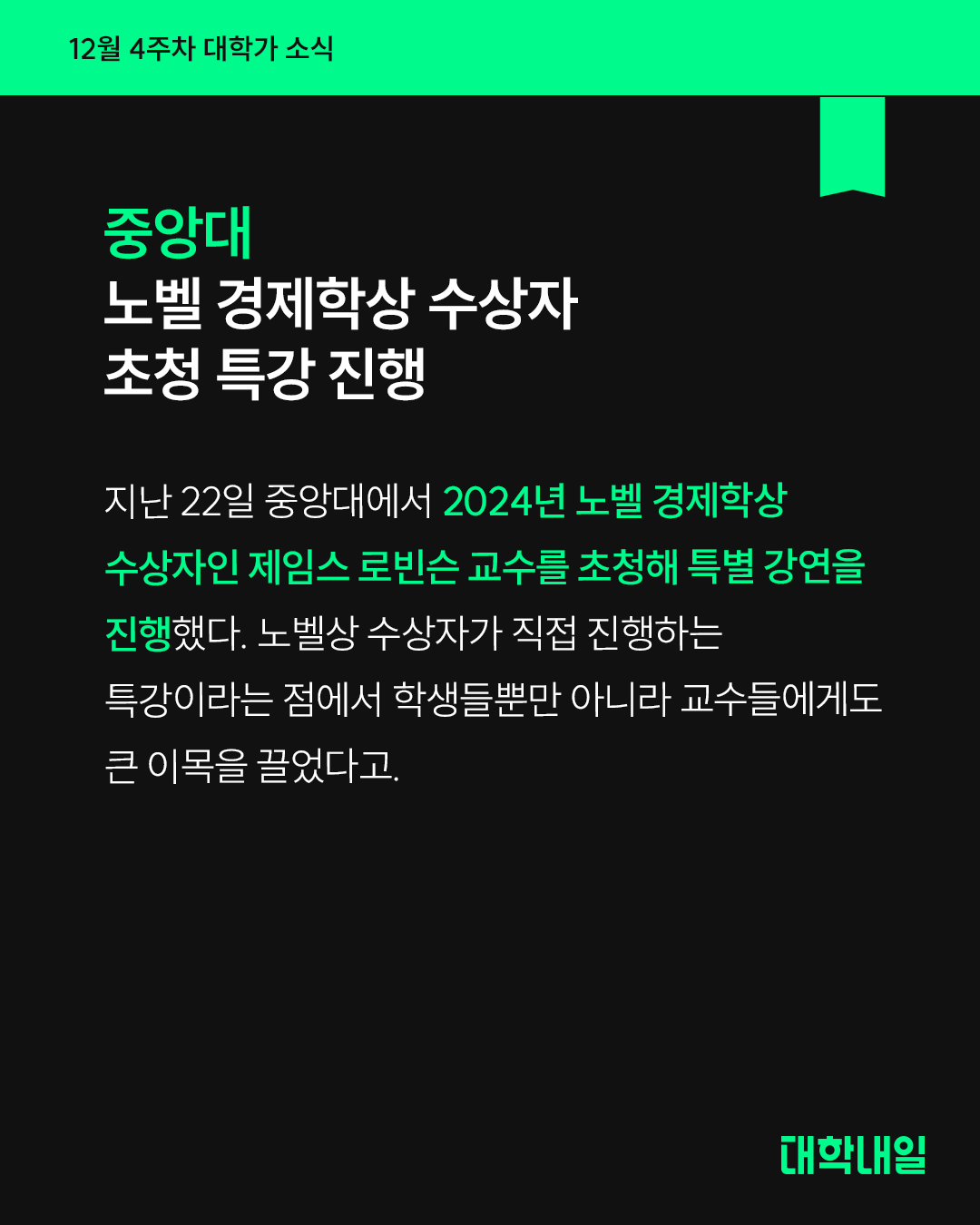 지난 22일 중앙대에서 2024년 노벨 경제학상 수상자인 제임스 로빈슨 교수를 초청해 특별 강연을 진행했다. 노벨상 수상자가 직접 진행하는 특강이라는 점에서 학생들뿐만 아니라 교수들에게도 큰 이목을 끌었다고.
