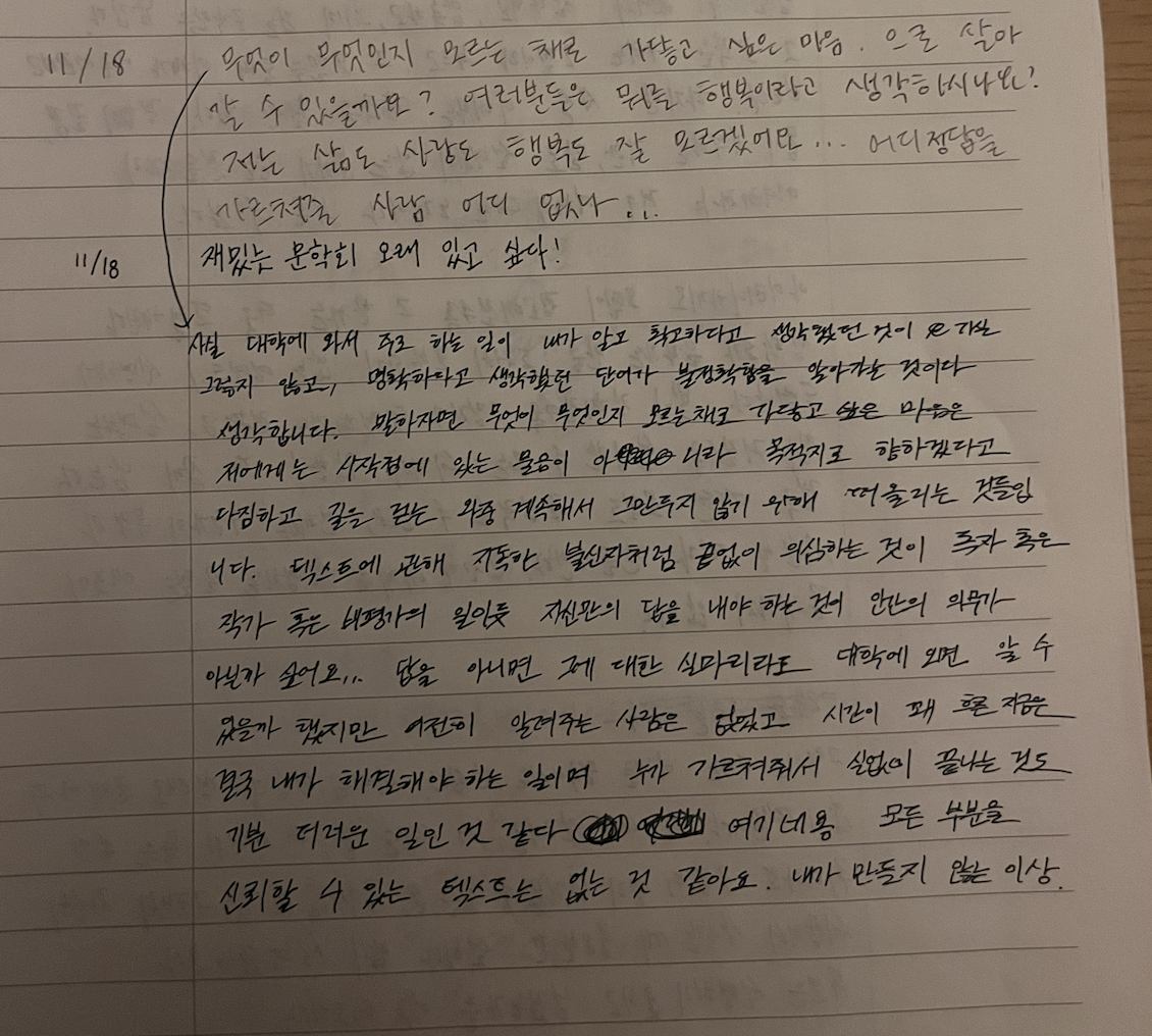 문학동아리는 확실히 다른 대학 동아리들과 결이 다른 것 같아요. 많은 동아리가 있지만, 학업에 관한 동아리나 운동 동아리처럼 삶의 먹고 사는 문제들에 도움을 주는 동아리, 온전한 놀이를 즐기는 동아리들과는 많이 다르다고 생각해요.