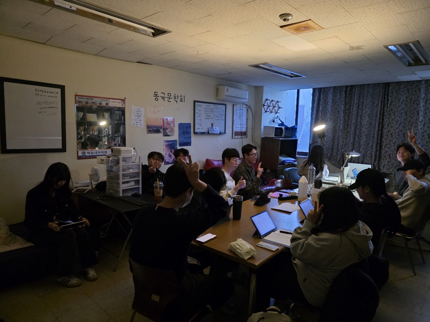 동국문학회는 1959년부터 시작된 동아리로 실제 저희 동아리 출신 중에 자대에서 교수까지 되신 분이 있으실 정도로 역사와 전통이 깊은 동아리입니다. 개인적으로 동국문학회 회칙 중 '벗들 우리는 느낍니다. 글을 써 본 사람만이 알 수 있는 아픔, 글을 써 본 사람만이 느낄 수 있는 기쁨, 그것을 경험한 사람의 뜨거운 가슴을 느낍니다' 이 슬로건이 저희 동국문학회를 잘 설명한다고 생각해요.