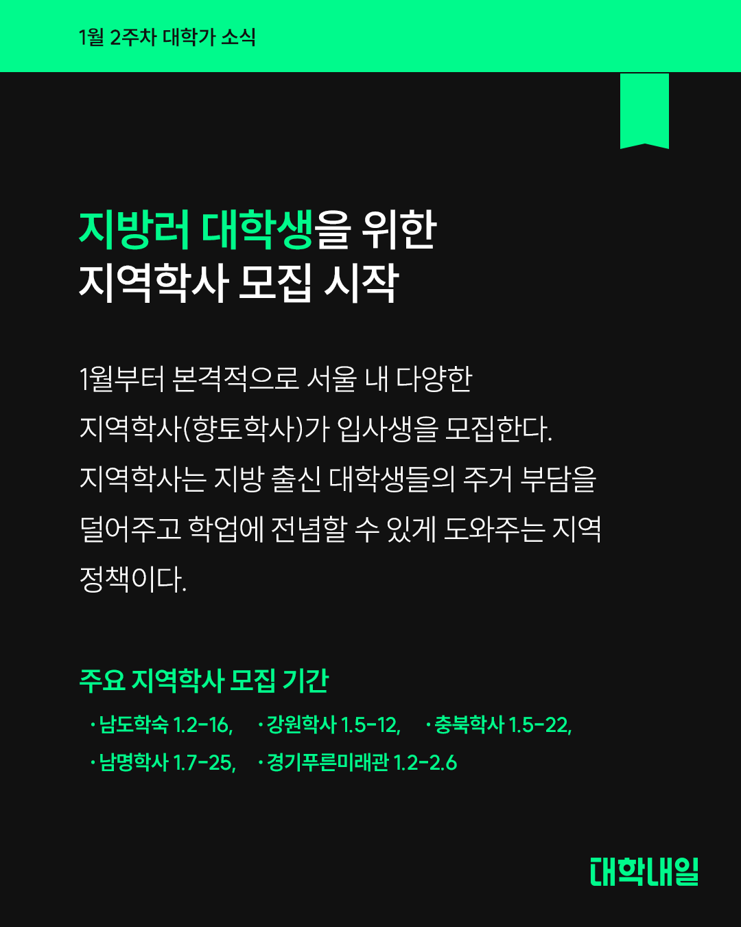 1월부터 본격적으로 서울 내 다양한 지역학사(향토학사)가 입사생을 모집한다. 지역학사는 지방 출신 대학생들의 주거 부담을 덜어주고 학업에 전념할 수 있게 도와주는 지역 정책이다.