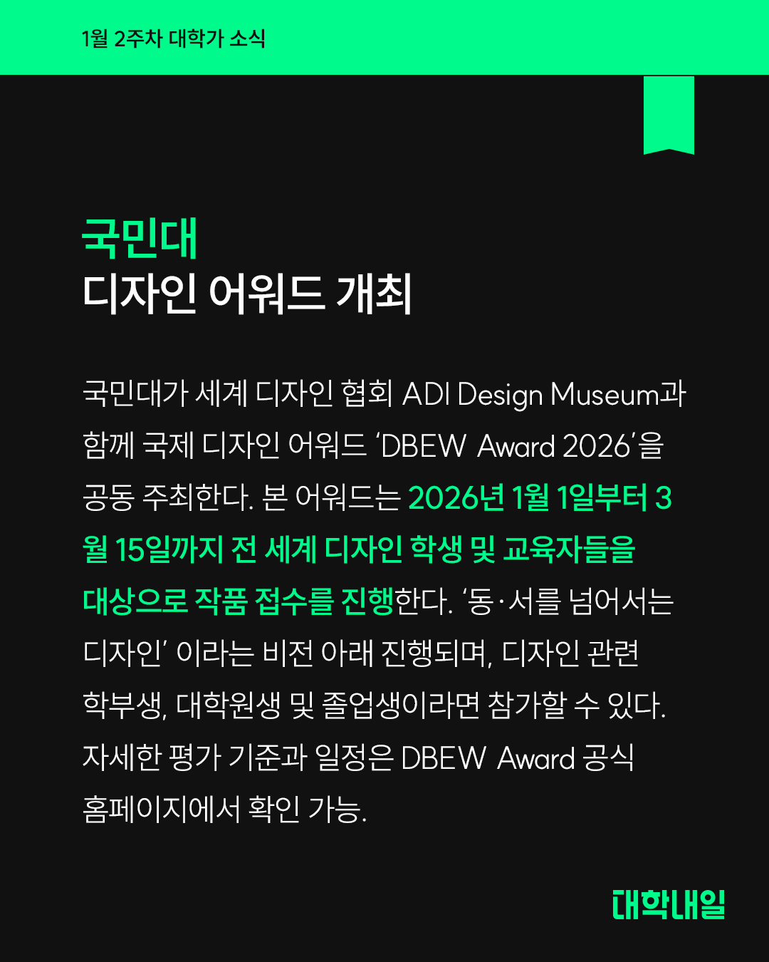 국민대가 세계 디자인 협회 ADI Design Museum과 함께 국제 디자인 어워드 ‘DBEW Award 2026’을 공동 주최한다. 본 어워드는 2026년 1월 1일부터 3월 15일까지 전 세계 디자인 학생 및 교육자들을 대상으로 작품 접수를 진행한다. ‘동·서를 넘어서는 디자인’ 이라는 비전 아래 진행되며, 디자인 관련 학부생, 대학원생 및 졸업생이라면 참가할 수 있다. 자세한 평가 기준과 일정은 DBEW Award 공식 홈페이지에서 확인 가능.