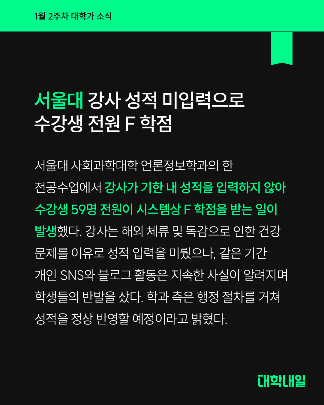 서울대 사회과학대학 언론정보학과의 한 전공수업에서 강사가 기한 내 성적을 입력하지 않아 수강생 59명 전원이 시스템상 F 학점을 받는 일이 발생했다. 강사는 해외 체류 및 독감으로 인한 건강 문제를 이유로 성적 입력을 미뤘으나, 같은 기간 개인 SNS와 블로그 활동은 지속한 사실이 알려지며 학생들의 반발을 샀다. 학과 측은 행정 절차를 거쳐 성적을 정상 반영할 예정이라고 밝혔다.