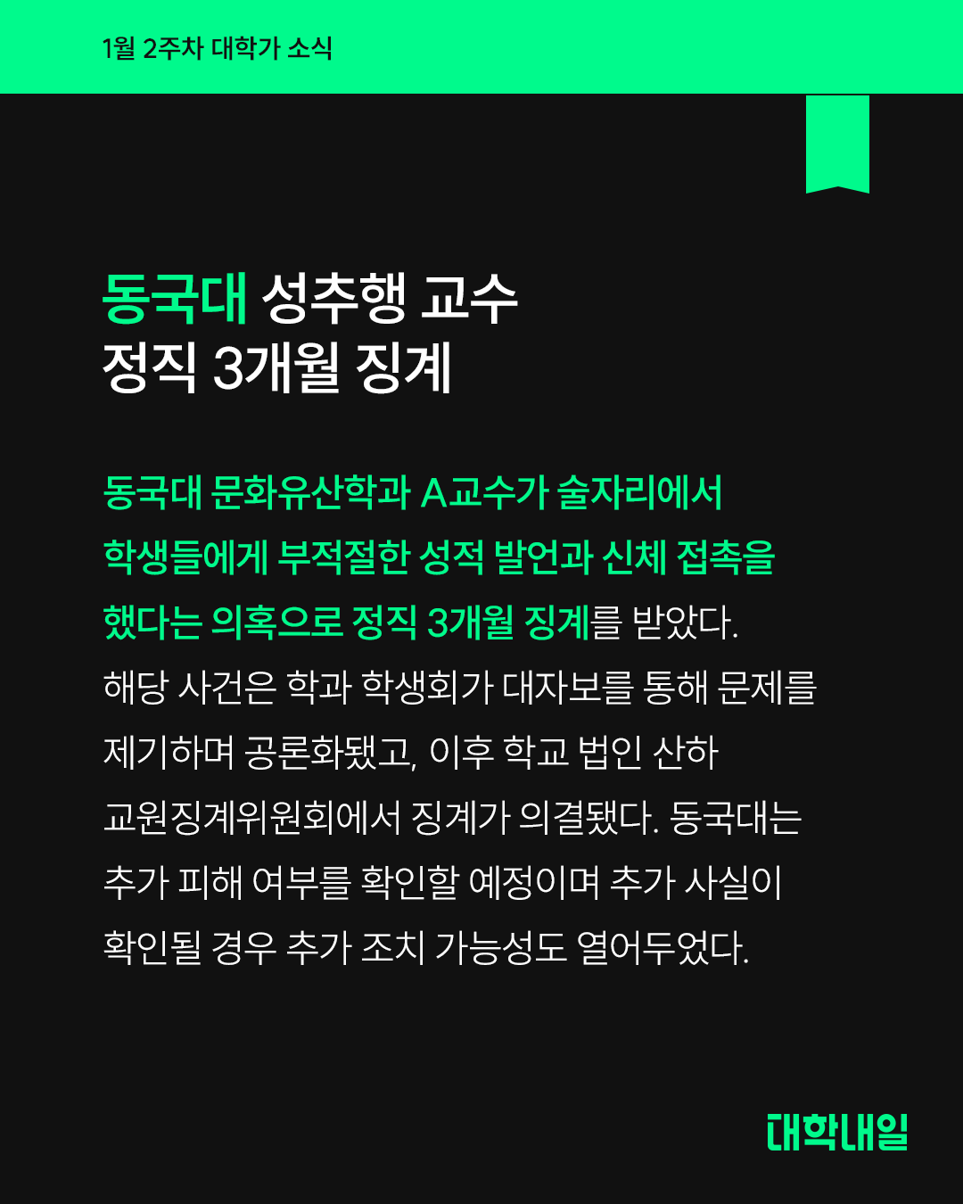 동국대 문화유산학과 A교수가 술자리에서 학생들에게 부적절한 성적 발언과 신체 접촉을 했다는 의혹으로 정직 3개월 징계를 받았다. 해당 사건은 학과 학생회가 대자보를 통해 문제를 제기하며 공론화됐고, 이후 학교 법인 산하 교원징계위원회에서 징계가 의결됐다. 동국대는 추가 피해 여부를 확인할 예정이며 추가 사실이 확인될 경우 추가 조치 가능성도 열어두었다.