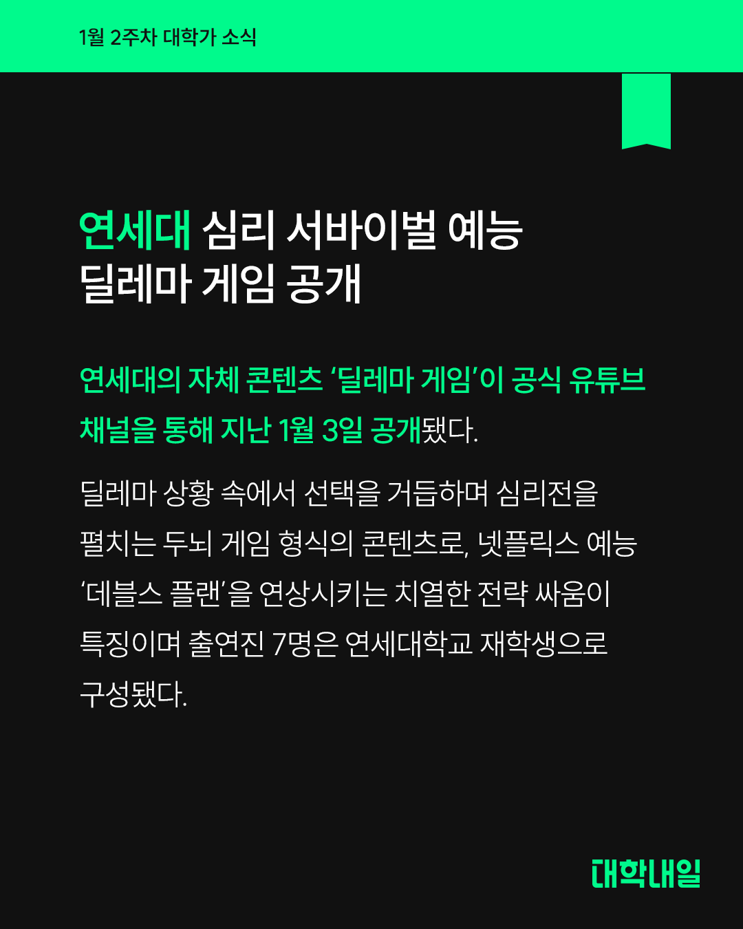 연세대의 자체 콘텐츠 <딜레마 게임>이 공식 유튜브 채널을 통해 지난 1월 3일 공개됐다. 딜레마 상황 속에서 선택을 거듭하며 심리전을 펼치는 두뇌 게임 형식의 콘텐츠로, 넷플릭스 예능 ‘데블스 플랜’을 연상시키는 치열한 전략 싸움이 특징이며 출연진 7명은 연세대학교 재학생으로 구성됐다.