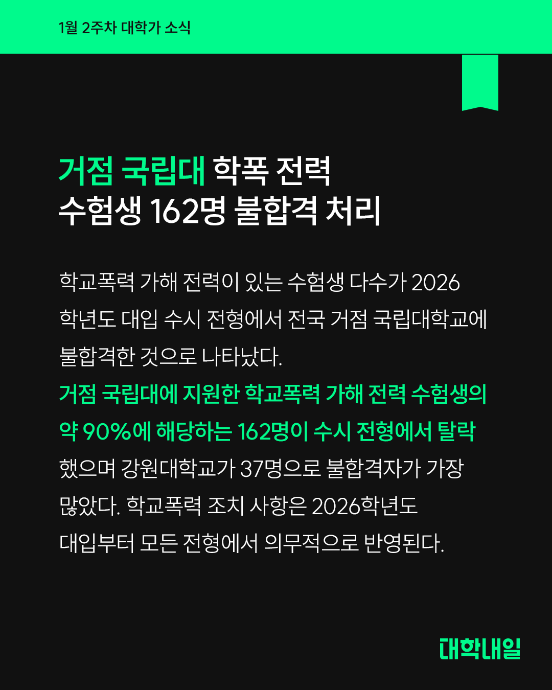학교폭력 가해 전력이 있는 수험생 다수가 2026학년도 대입 수시 전형에서 전국 거점 국립대학교에 불합격한 것으로 나타났다. 거점 국립대에 지원한 학교폭력 가해 전력 수험생의 약 90%에 해당하는 162명이 수시 전형에서 탈락했으며 강원대학교가 37명으로 불합격자가 가장 많았다. 학교폭력 조치 사항은 2026학년도 대입부터 모든 전형에서 의무적으로 반영된다.