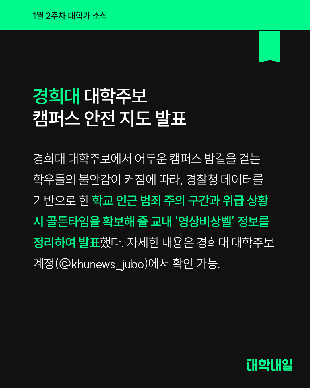 경희대 대학주보에서 어두운 캠퍼스 밤길을 걷는 학우들의 불안감이 커짐에 따라, 경찰청 데이터를 기반으로 한 학교 인근 범죄 주의 구간과 위급 상황 시 골든타임을 확보해 줄 교내 ‘영상비상벨’ 정보를 정리하여 발표했다. 자세한 내용은 경희대 대학주보 계정(@khunews_jubo)에서 확인 가능.