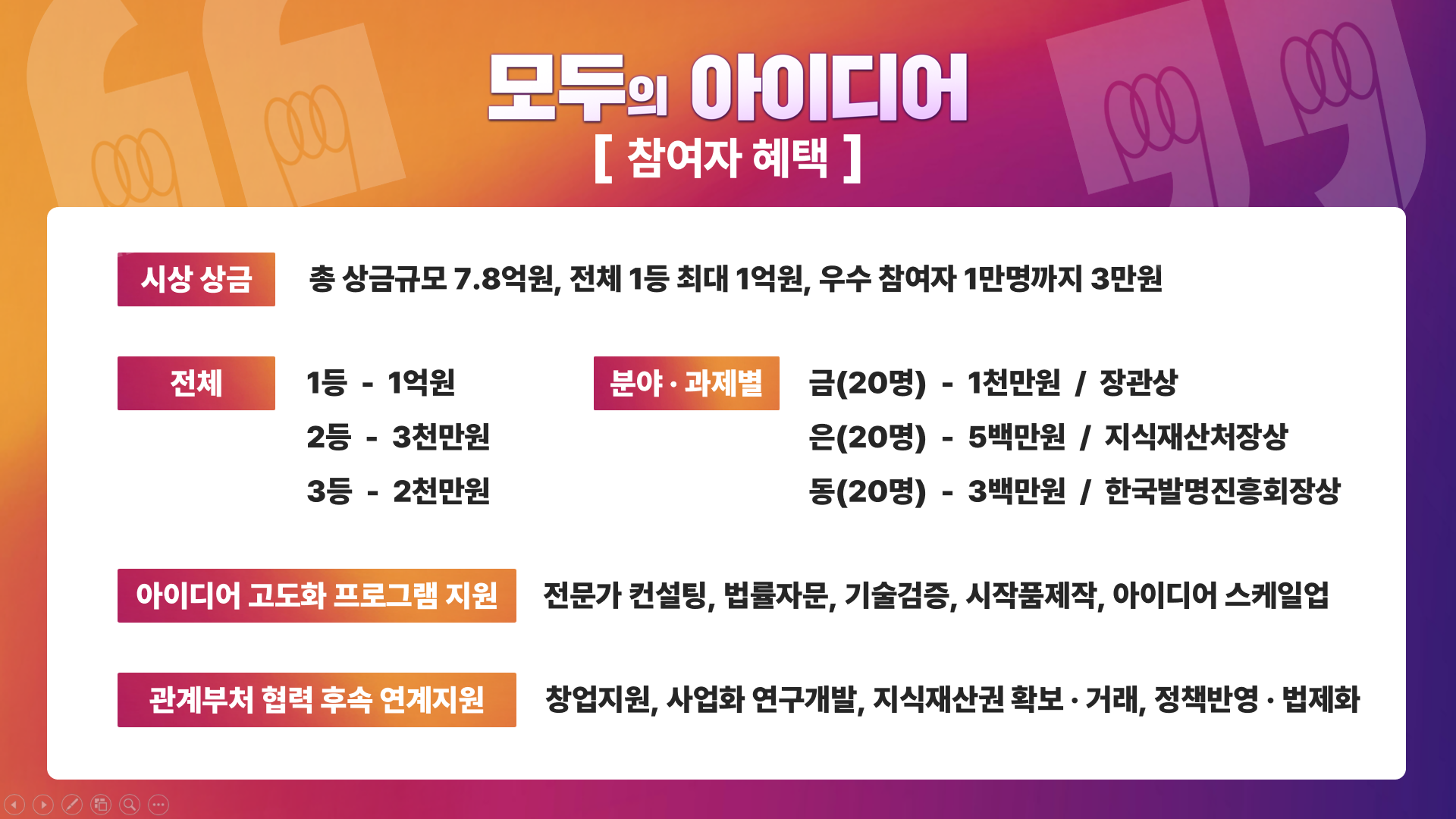 지난 1월 8일부터 대한민국 지식재산처가 총상금 7.8억짜리 공모전 <모두의 아이디어>를 개최했다. 역대 정부부처 아이디어 공모전 중에서도 최대 규모다.