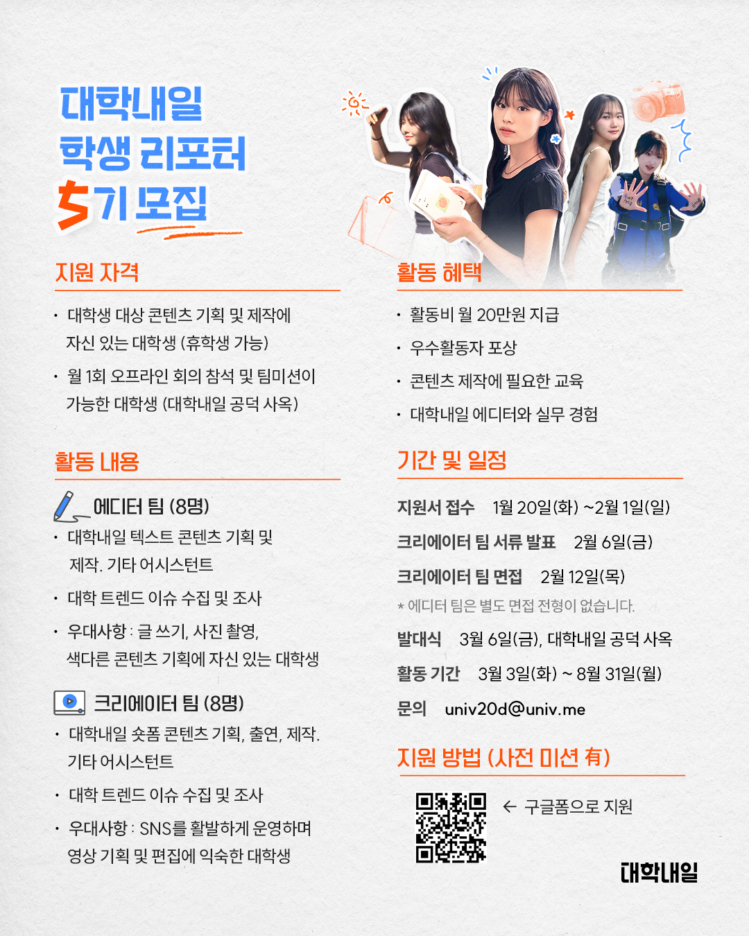 대학내일은 창간 이래 27년간 수많은 대학생과 교류하며, 20대의 목소리를 가장 가까이에서 담아왔습니다. 빠르게 바뀌는 트렌드의 흐름 속에서 절대 놓치지 말아야 할 20대의 이야기를 전해줄 학생 리포터를 찾고 있습니다. 대학내일 에디터와 함께 글로, 영상으로, 그리고 자신만의 기획으로 대학내일을 대표할 대학생 여러분을 기다리겠습니다.