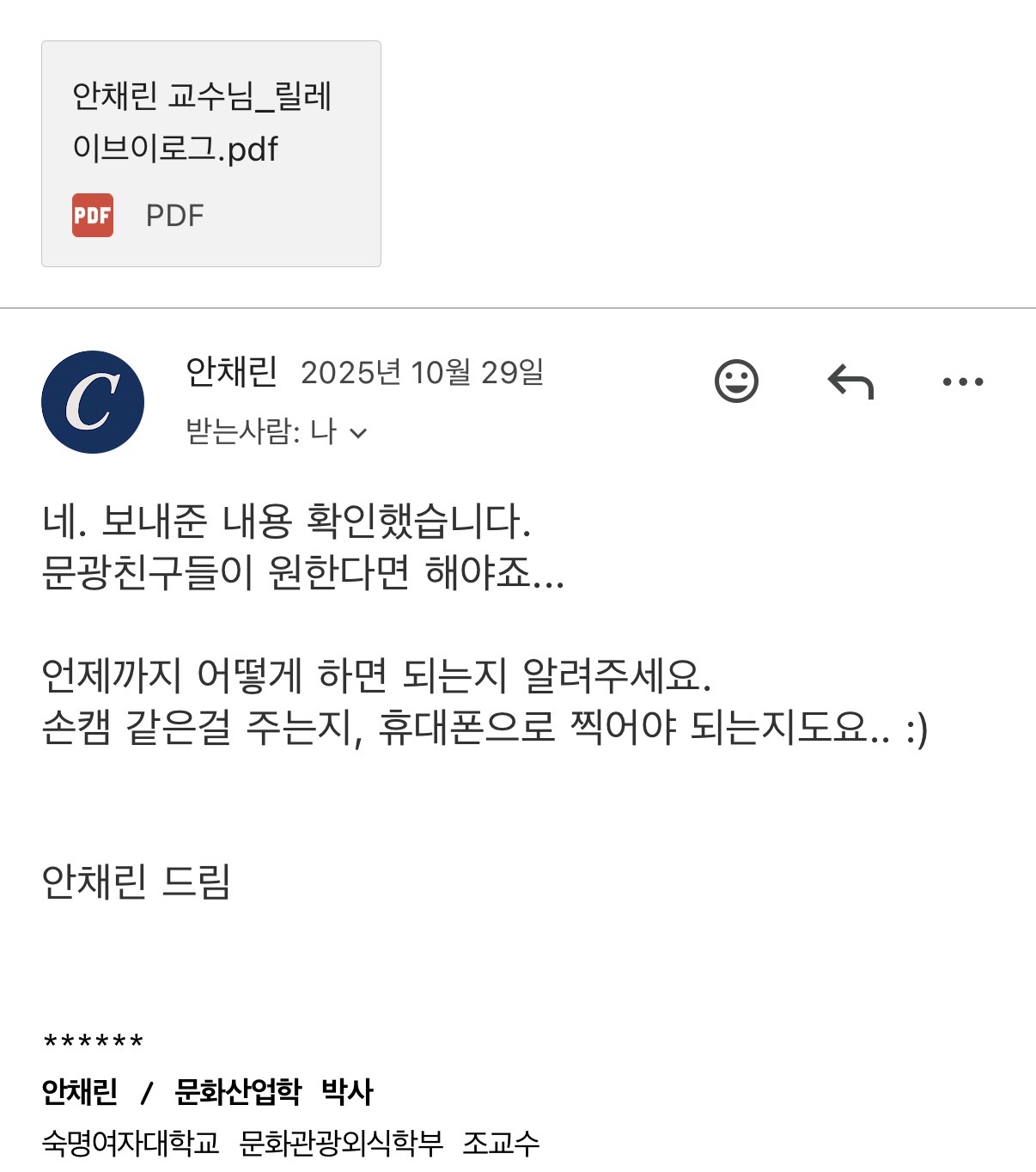 문화관광학전공 안채린 교수님 섭외 메일교수님이 직접 촬영하시다 보니 재밌는 에피소드도 있었을 것 같아요.