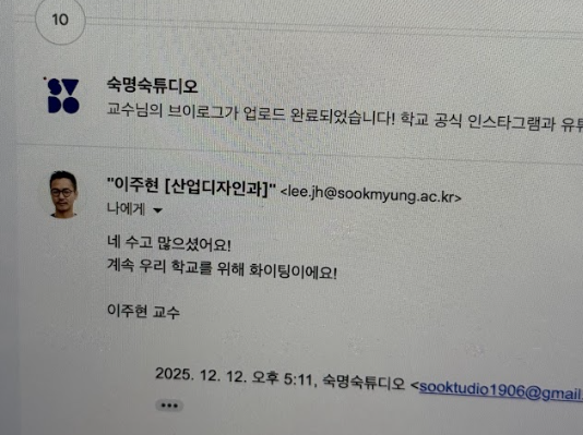 사실 업로드 전에 완성본을 교수님들께 먼저 공유드려요. 그래서인지 업로드를 더 손꼽아 기다리시더라고요. “언제 업로드되나요?”라는 메일을 정말 많이 받았습니다. 업로드 이후에는 '좋은 결과물 만들어주어 고맙다’는 메일을 많이 보내주셨어요. 개인 인스타그램 계정으로 직접 댓글을 남겨 주시기도 하고, 본인의 영상에 달린 다른 댓글에 '좋아요'를 눌러 주기도 하셨습니다.