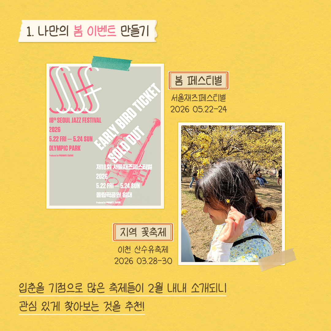 4~5월에 열리는 주요 봄 페스티벌과 축제들의 일정을 체크하고 미리 예매해서 나만의 봄 이벤트를 만들어두자. 정신없는 개강 시즌을 버티게 하는 원동력이 될 것이다.